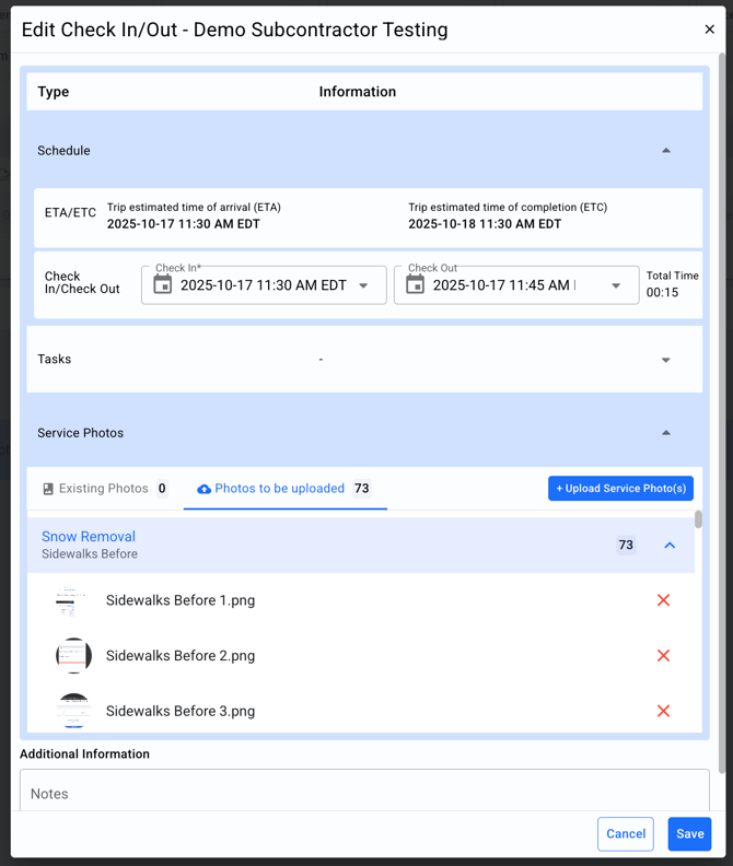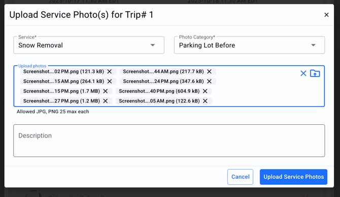 We have enabled Users to upload multiple photos during a trip adjustment, with support for labeling images as "before" or "after" for specific service actions. Supported file formats include JPG and PNG, with a maximum file size of 25MB per photo.