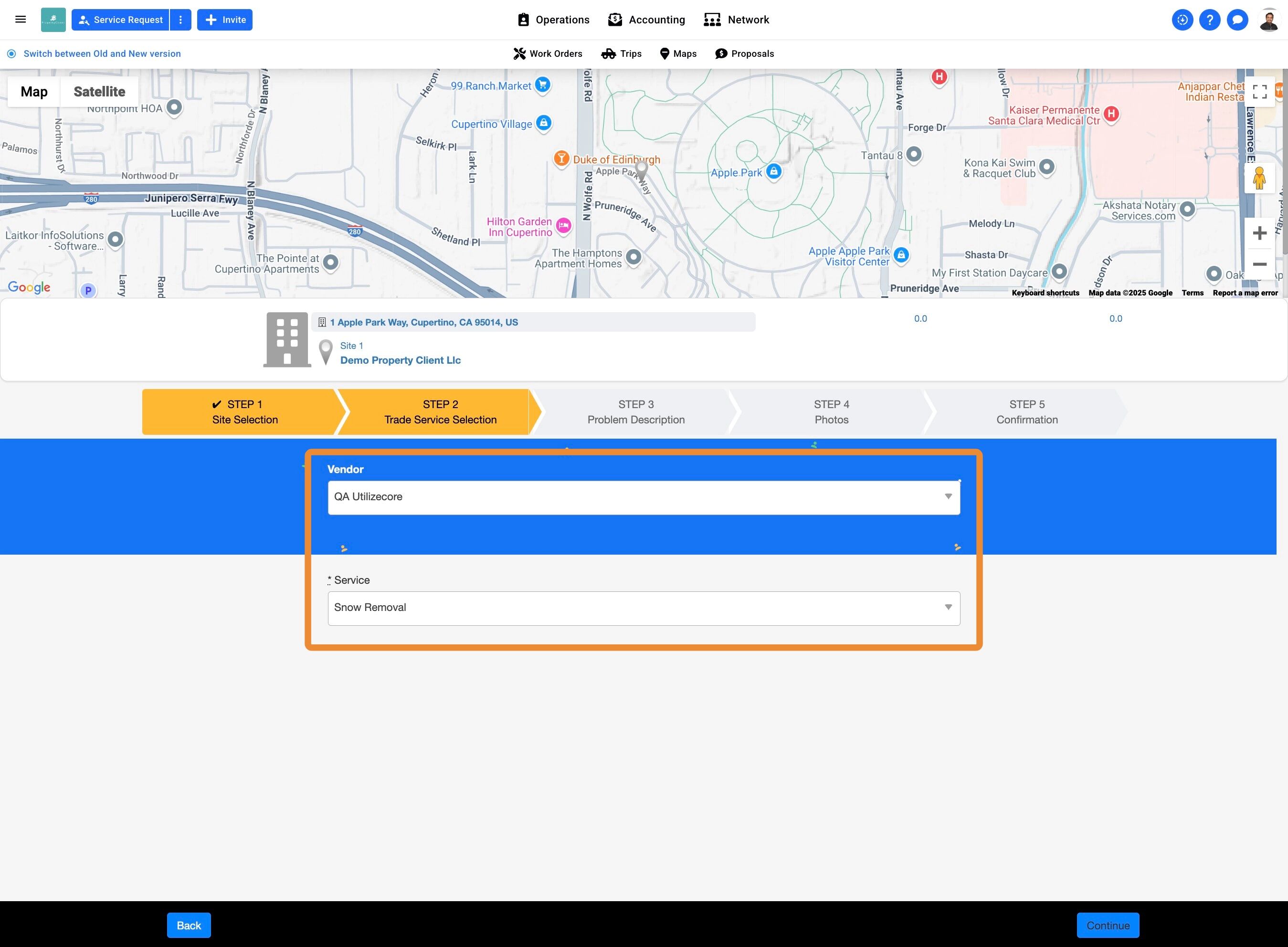 4. Select a Vendor name and a Service from the dropdown list. Click on the "Continue" button at the bottom right corner