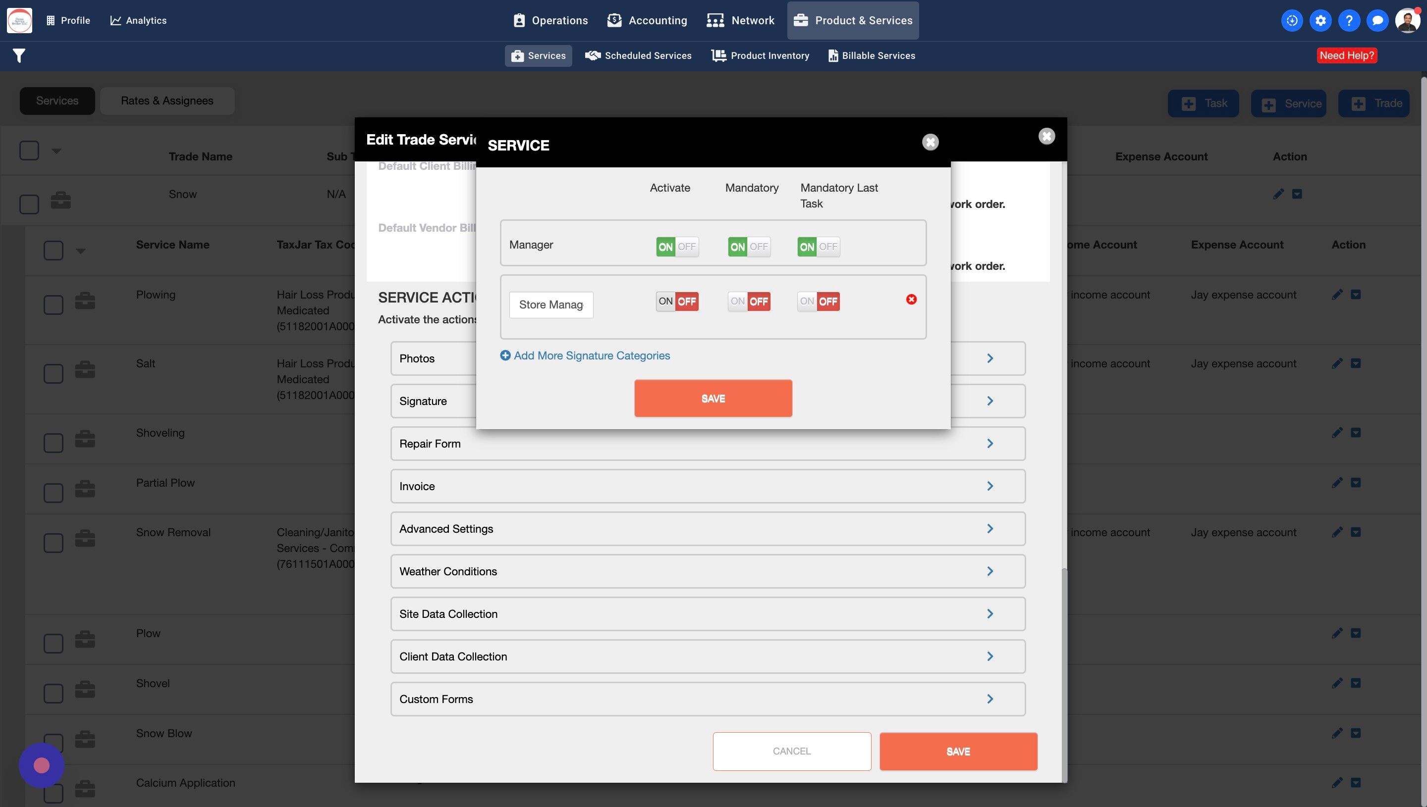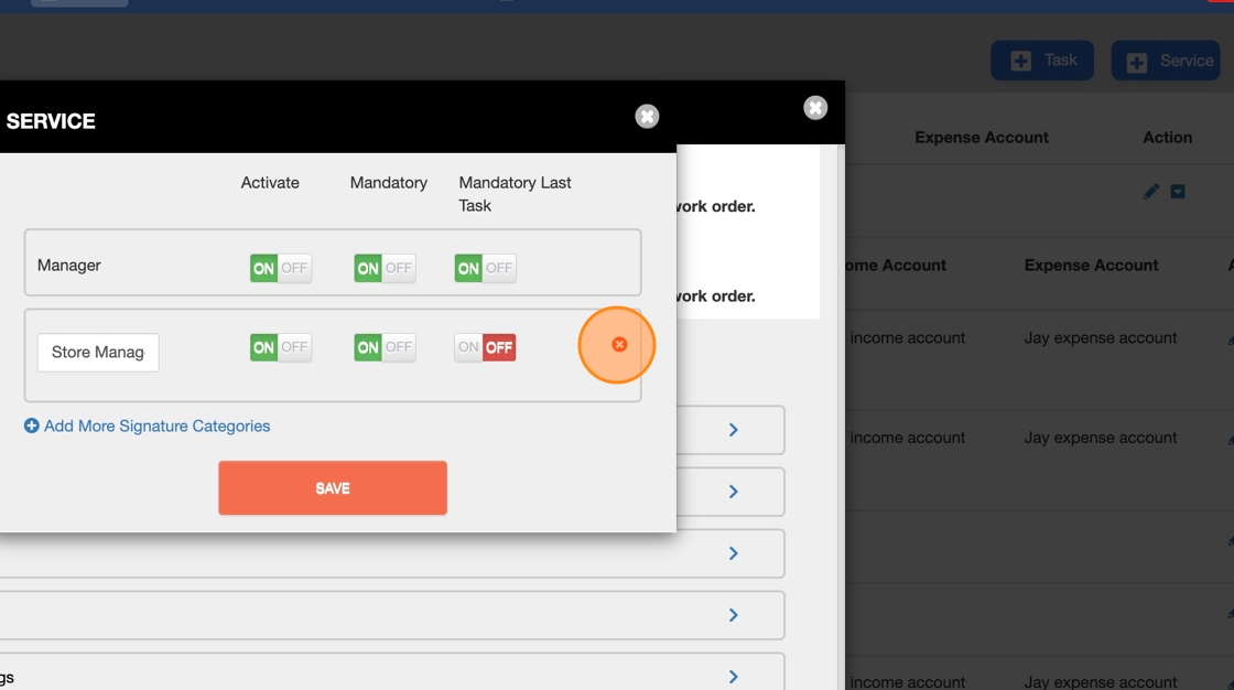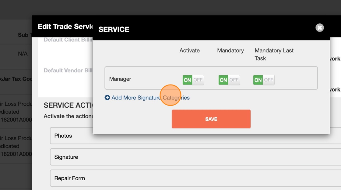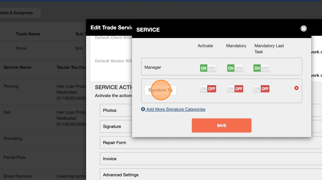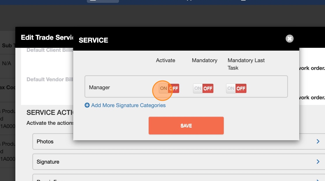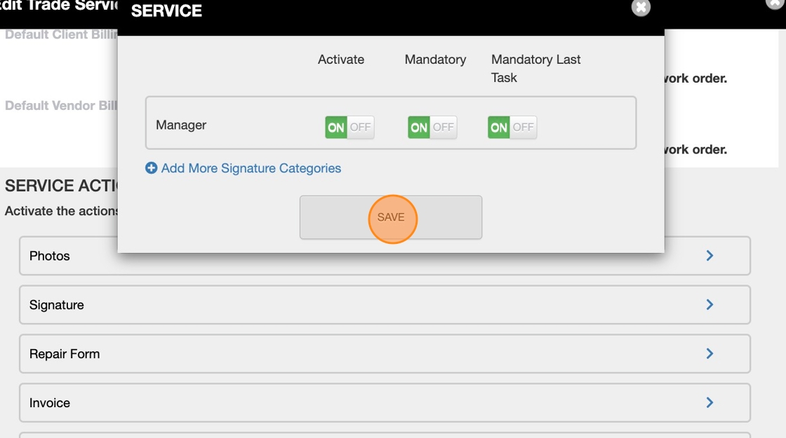 You can add/update service settings, activate signature, make it mandatory, and add new signature categories