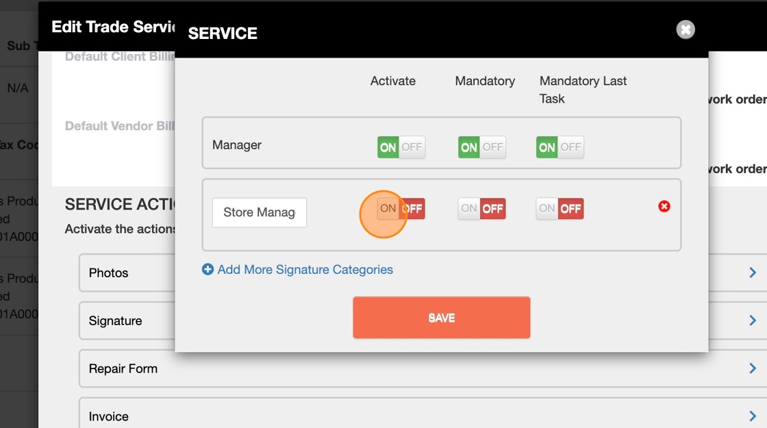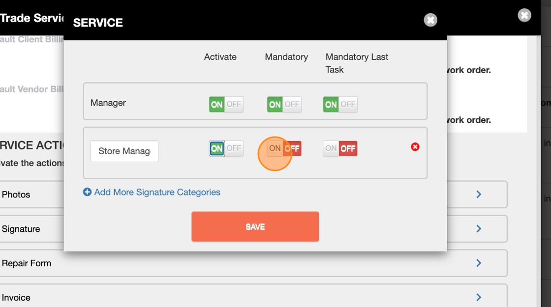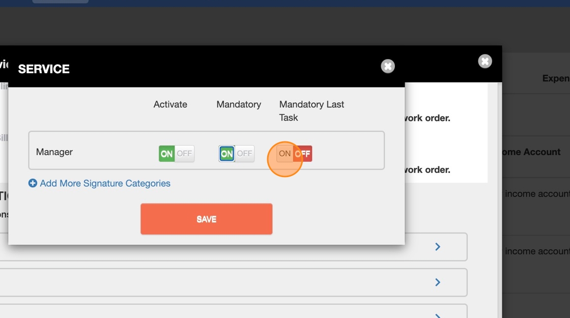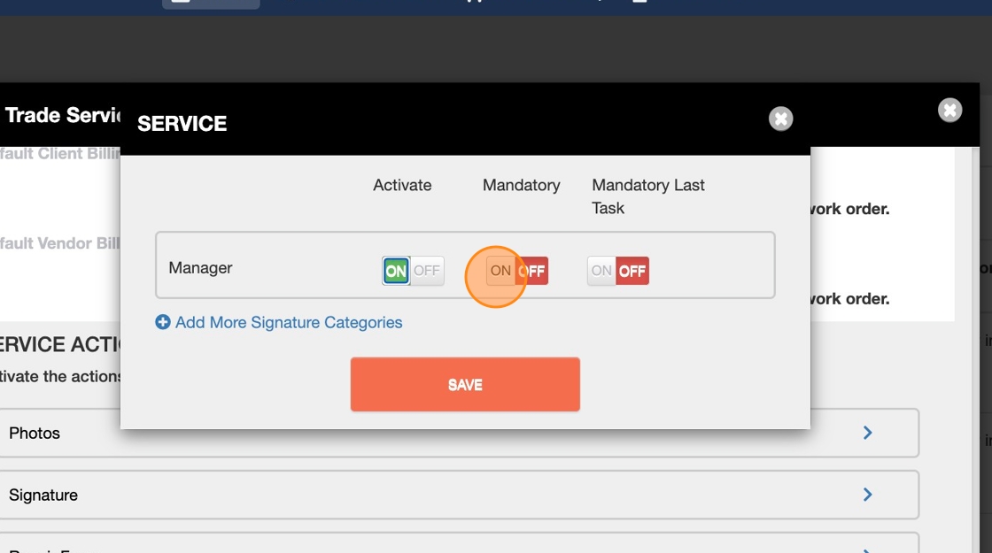 8. Click "ON" under "Mandatory Last Task" column. This will not allow your technicians to check out with a signature