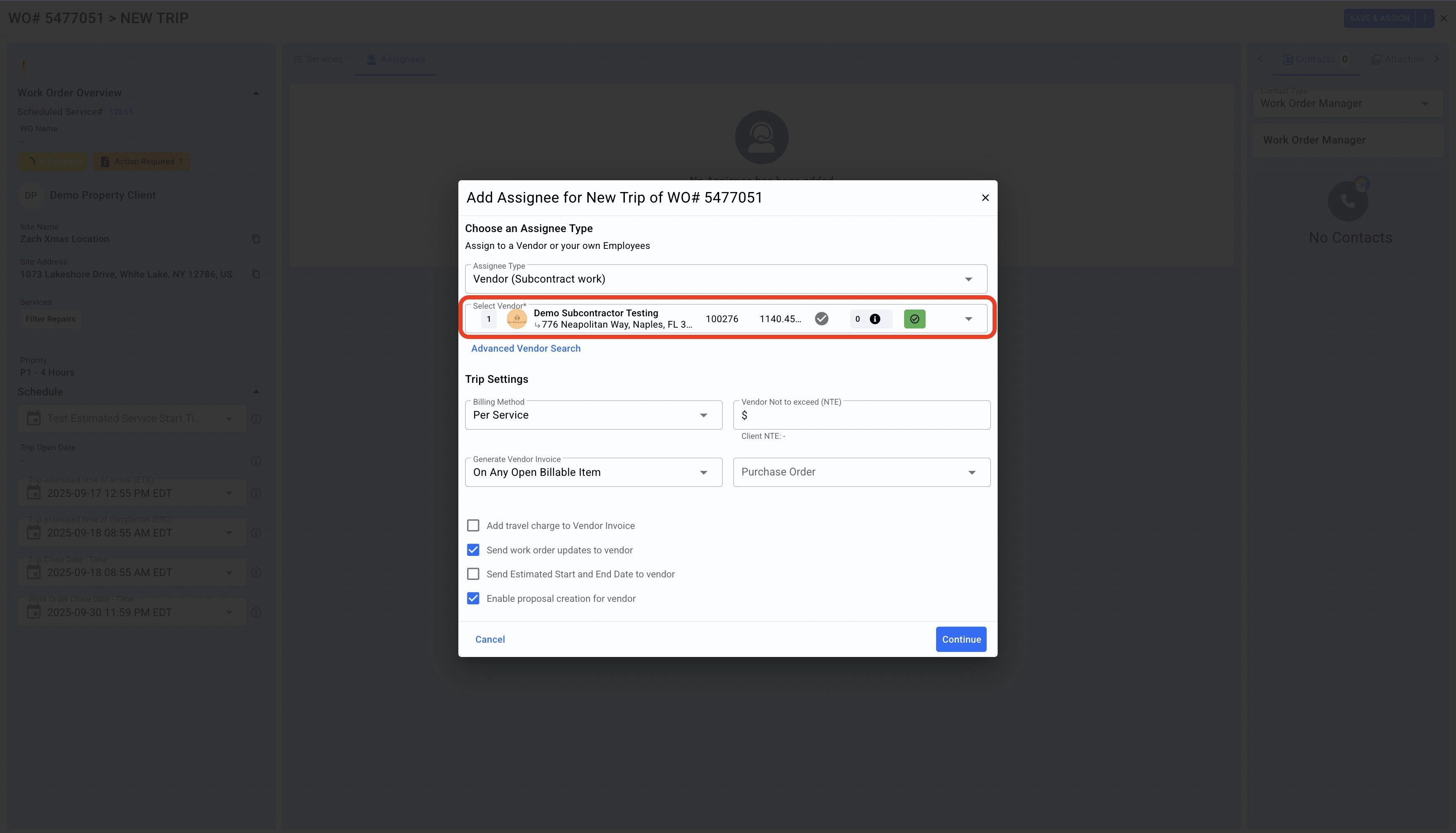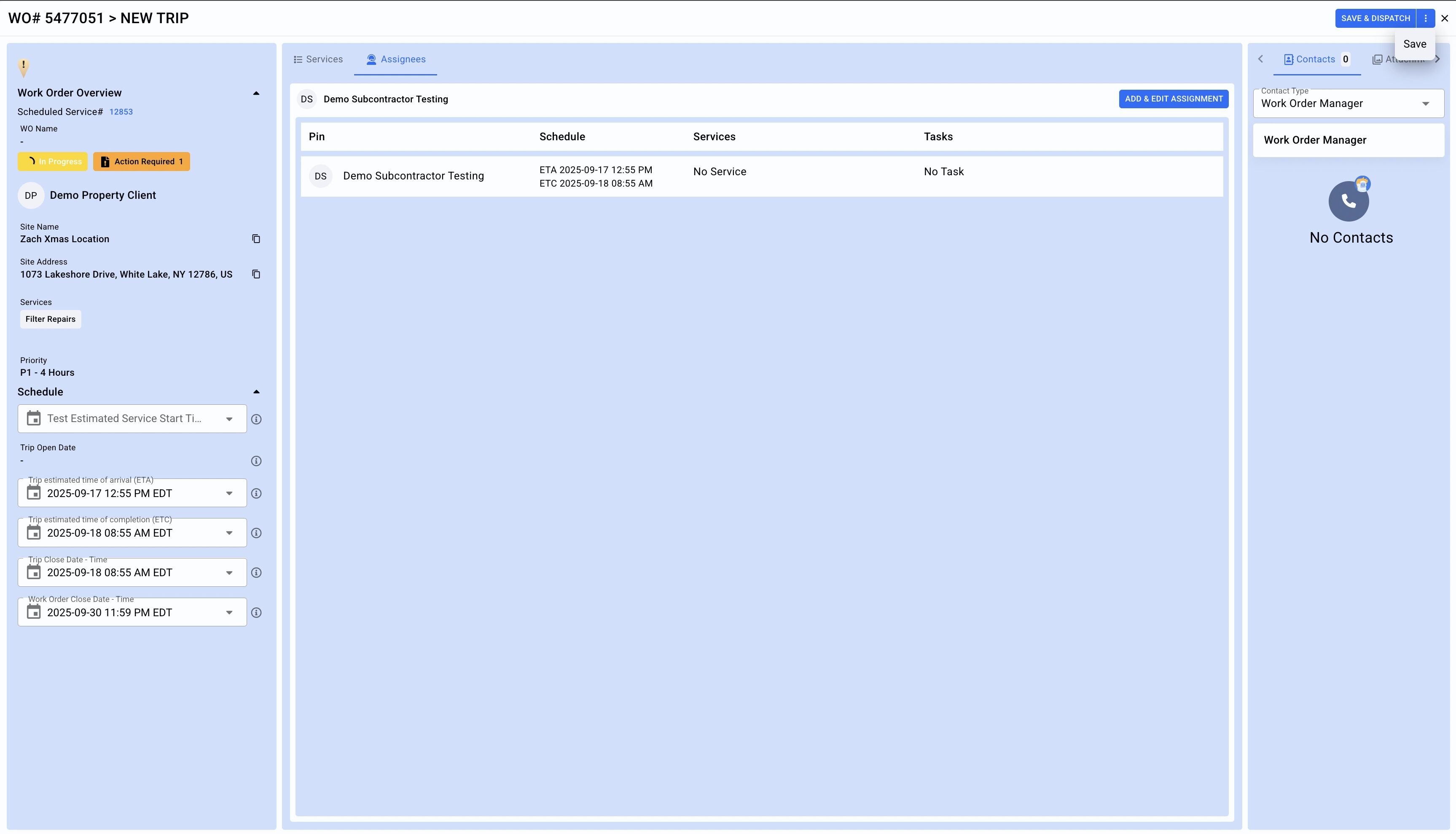 Note: If you click on the button 'Save & Dispatch' this will dispatch the Trip and the Vendor will be able to see this Work Order in the mobile app.