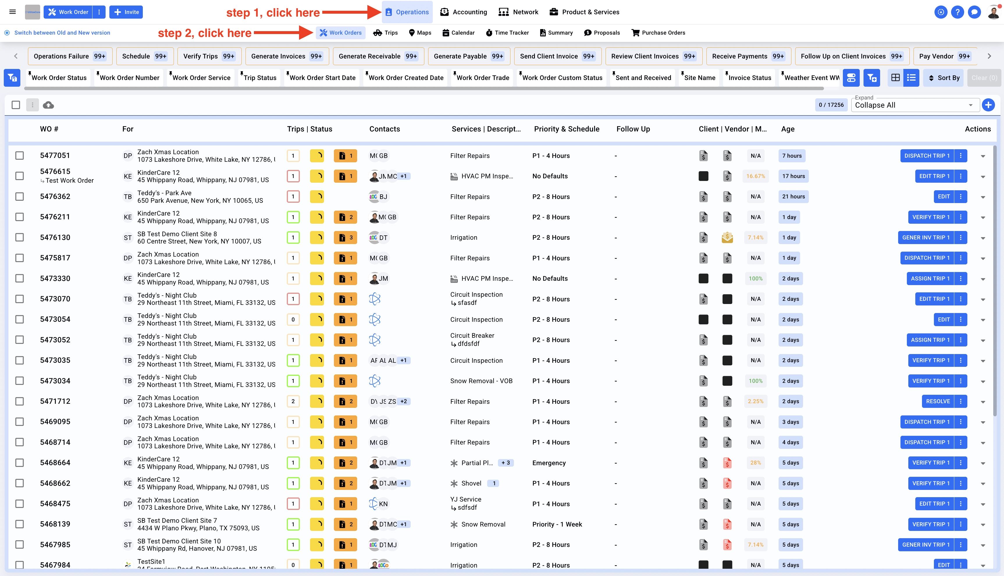 1. Click on "Operations" on the top center menu, and select "Work Orders" from the sub-menu. Click on the Work Order number to go to the Work Order details panel