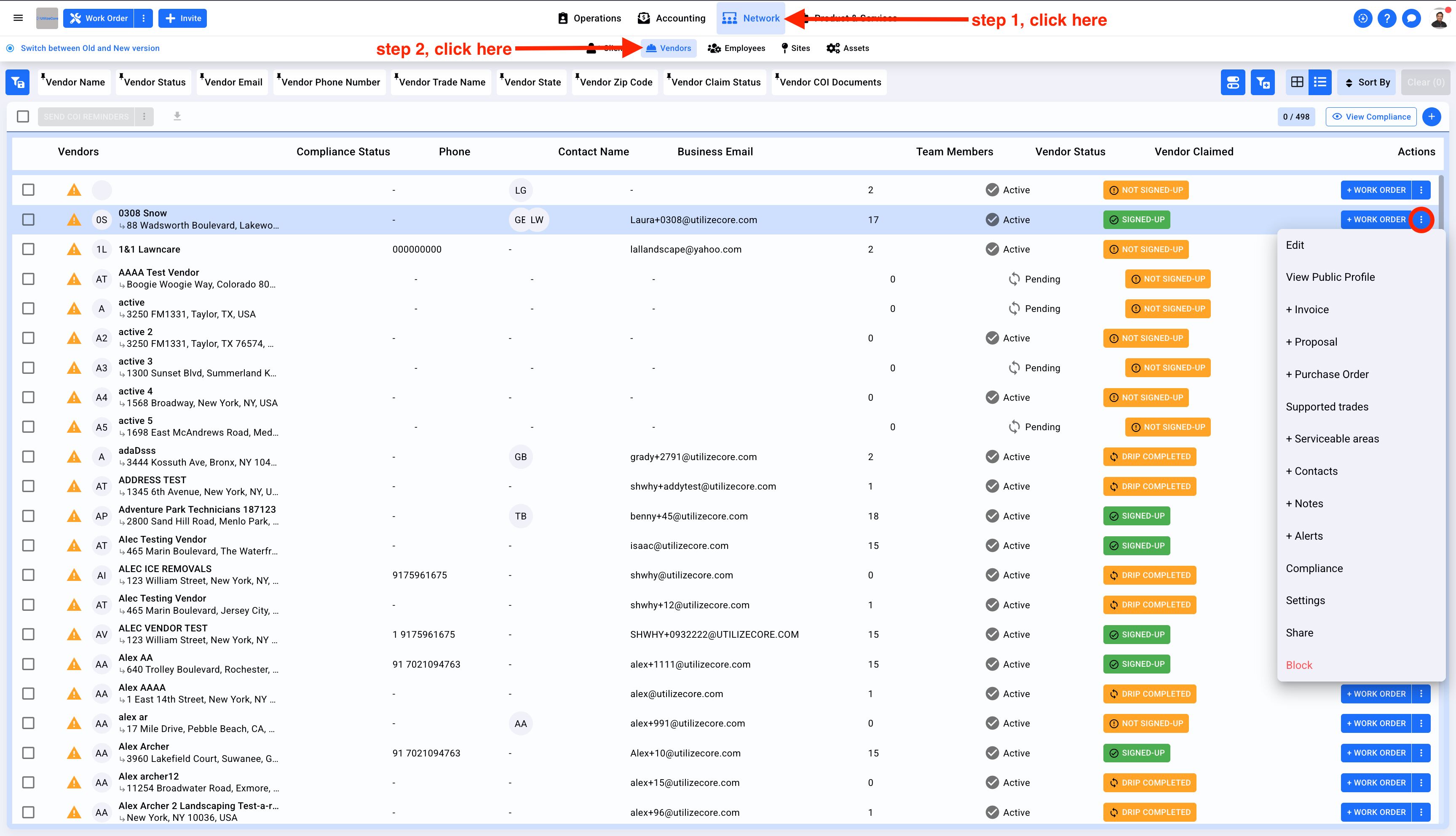 1. Click on Network on the top center menu and select Vendors from the sub-menu. Click on the three dots for any Vendor on the far right and select Edit
