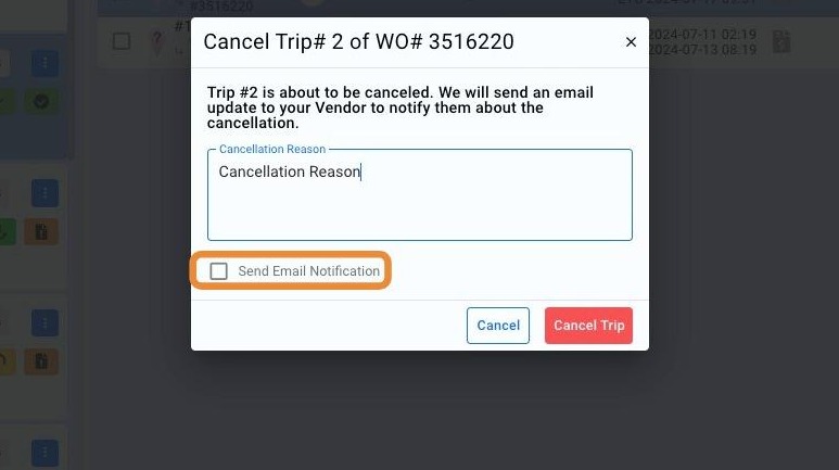 7. Click "Send Email Notification" if you would like an email Notification sent about the canceled Work Order