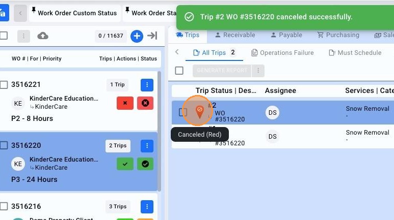 10. Note: The Pin color has changed to reflect the canceled trip but you will still be able to see the Trip