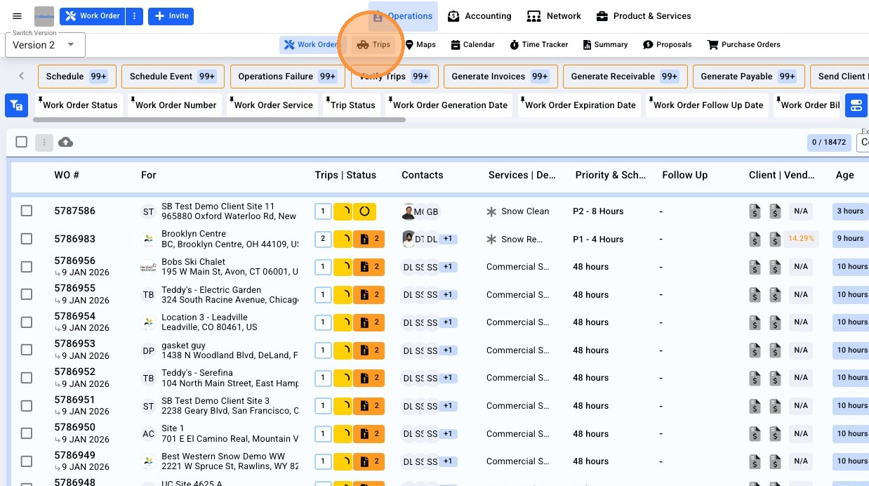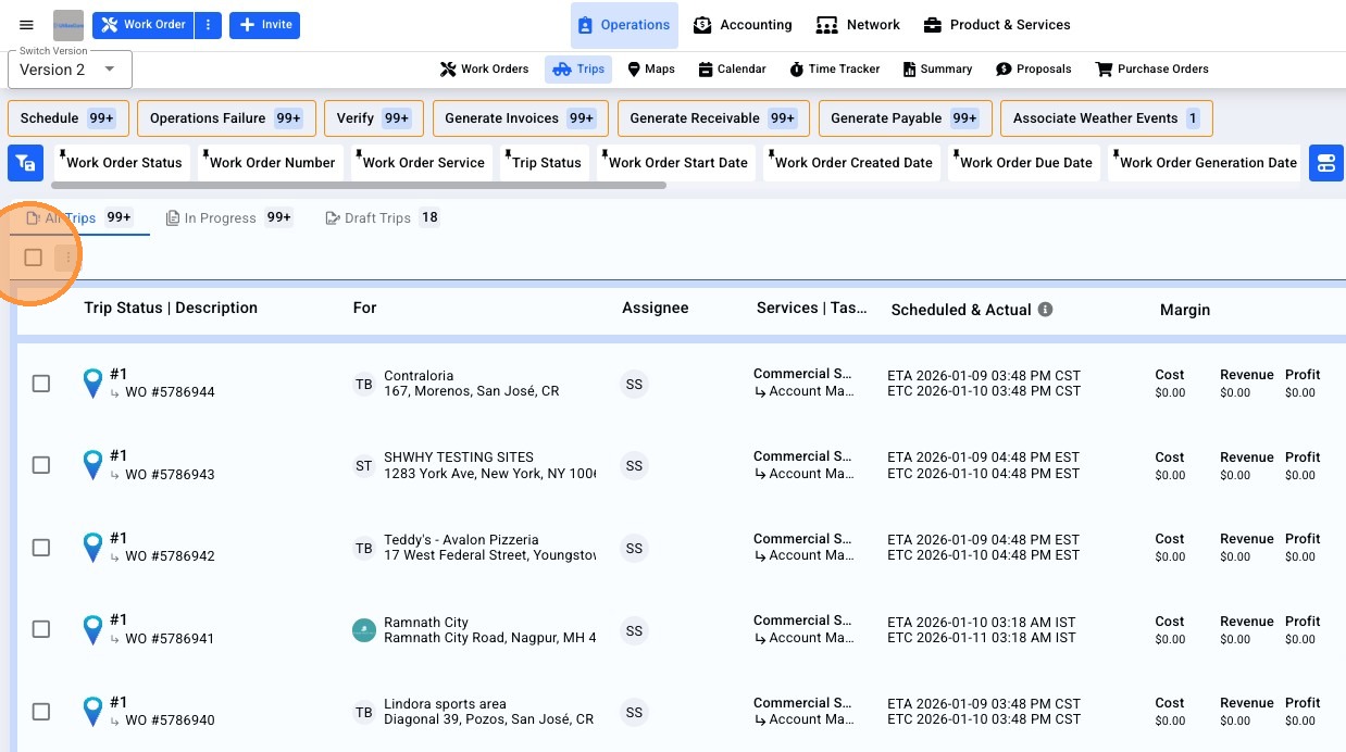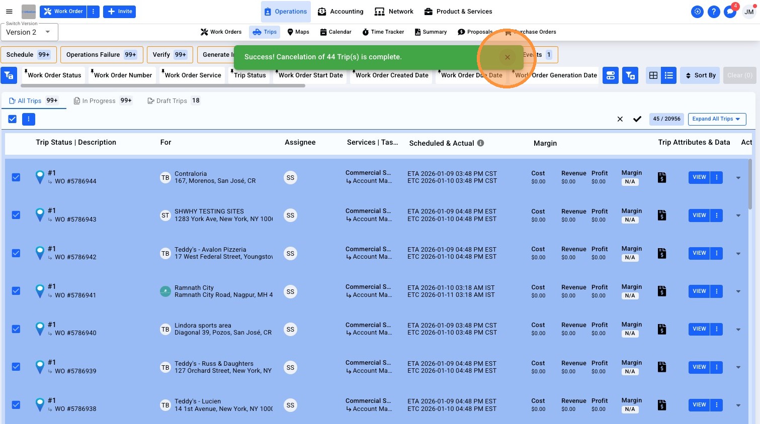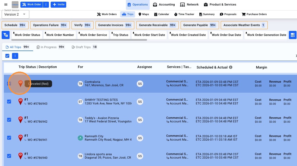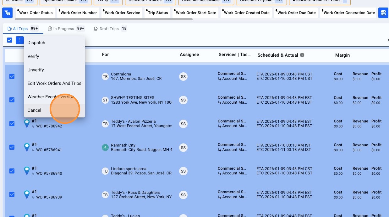 You have the ability to cancel trips in bulk from the Trip list. A common workflow in which this bulk cancel trip function is useful is for monthly work orders; to cancel all trips still open at the end of the month in order to begin your billing cycle.