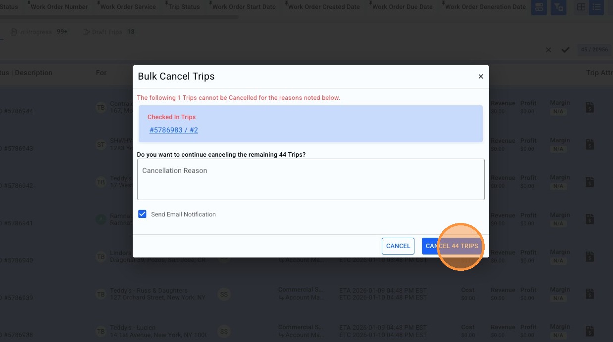 4. The system will display any Trips unable to be canceled due to validation rules. You can also include a 'Cancellation Reason' and send a notice of cancellation to the Trip assignee.