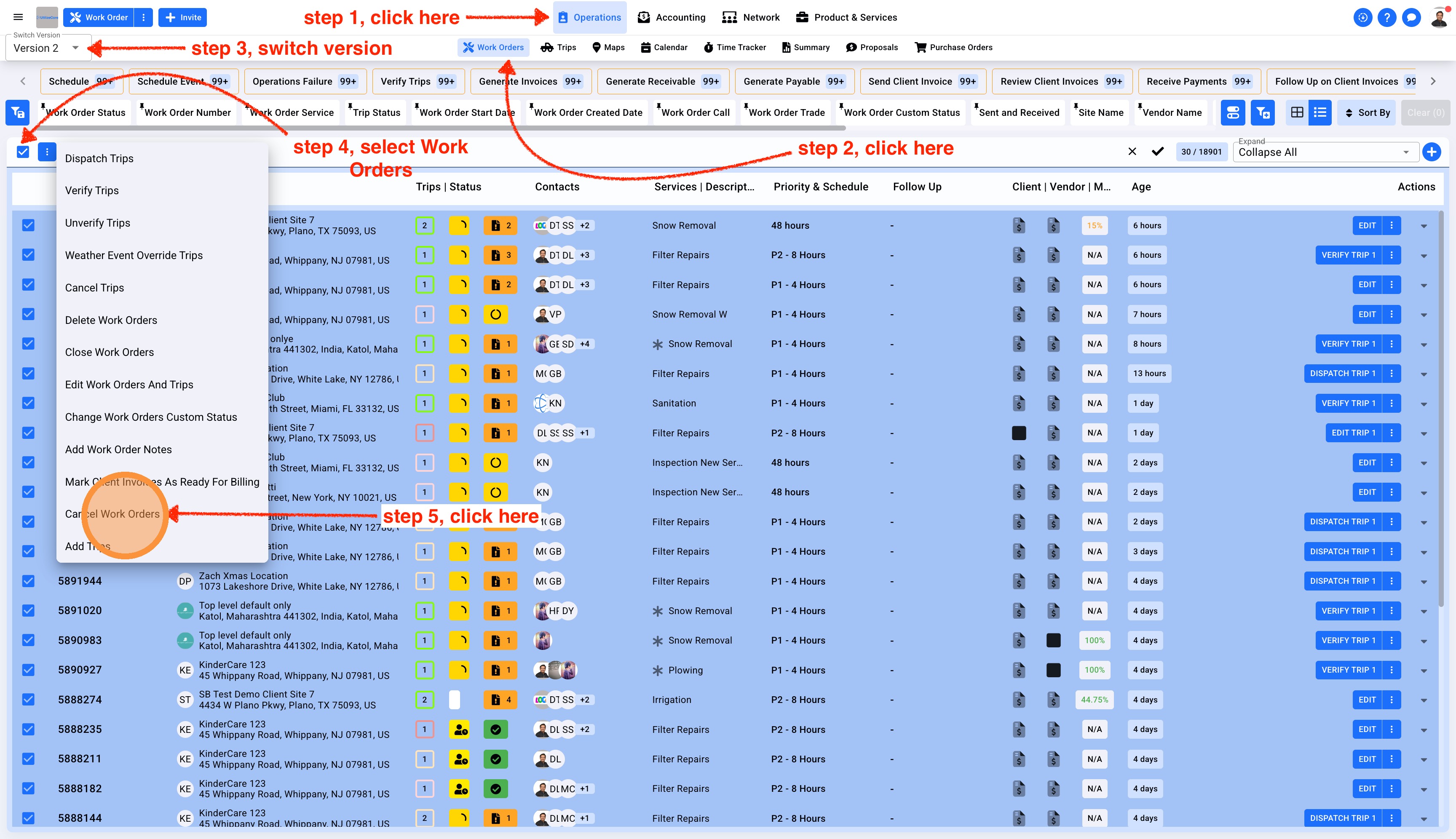 1. Click on Operations in the top center menu, select Work Orders from the sub-menu. Make sure to switch to Version 2 from the top left corner. Select the Work Orders in bulk by clicking on the main checkbox and click on the three dots to view multiple options. Select Cancel Work Orders.