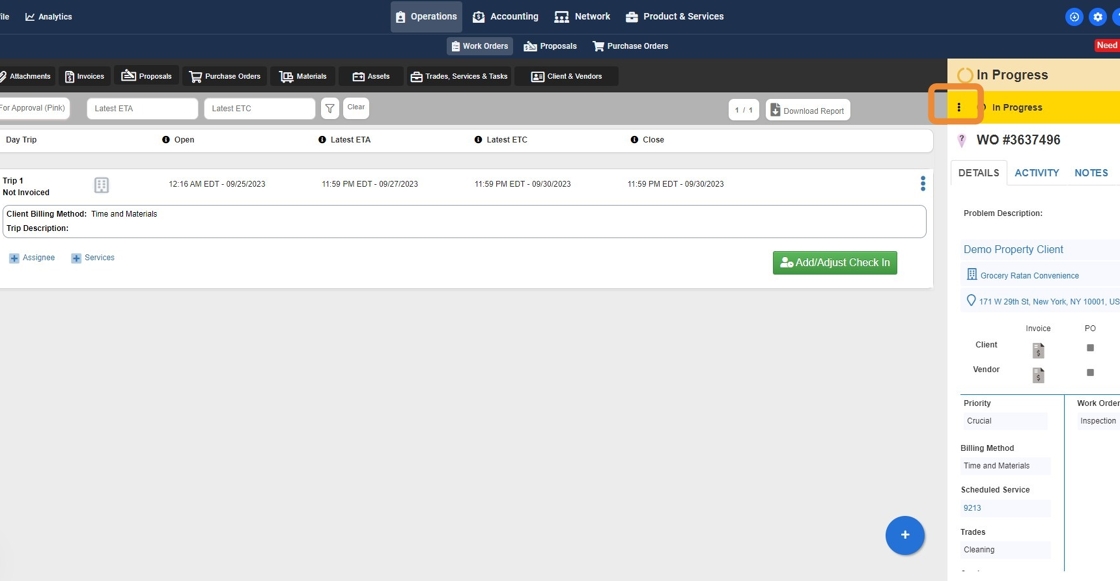 4. Click on the 3 dots on the right hand side of the Work Order details page