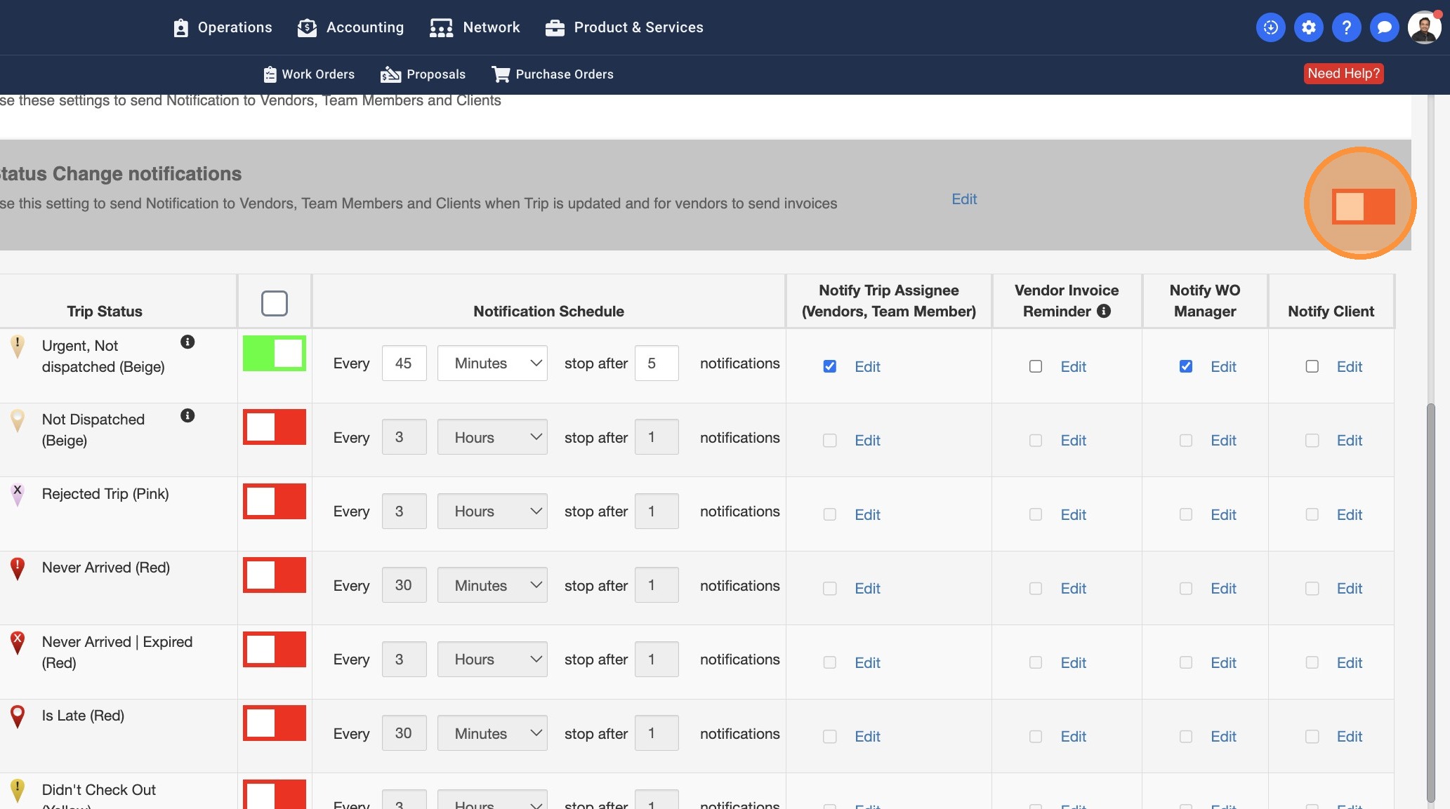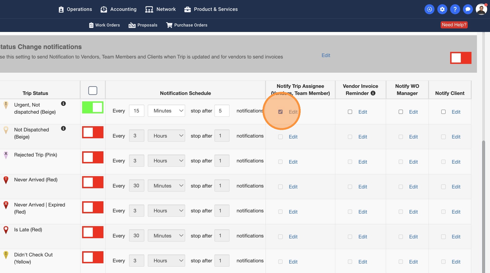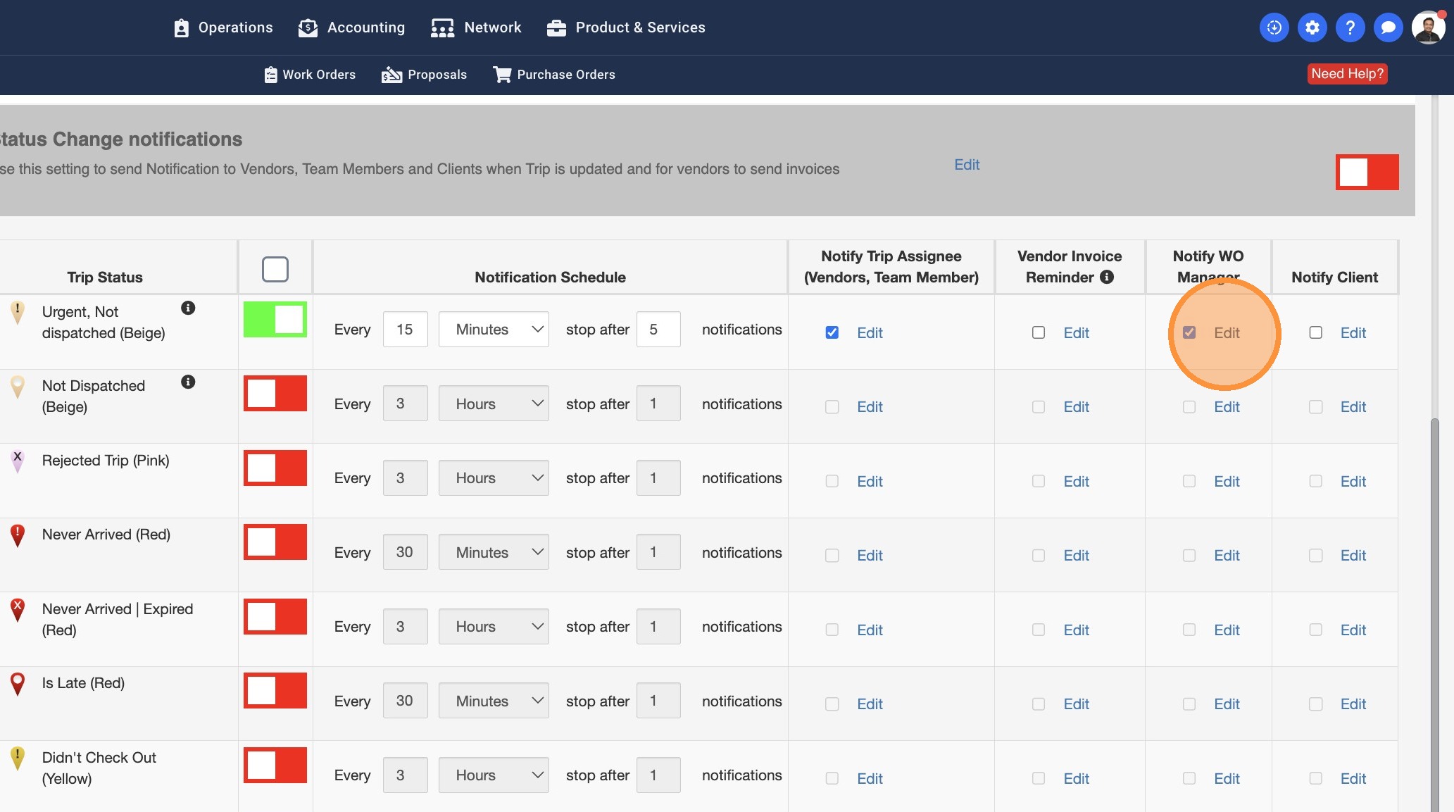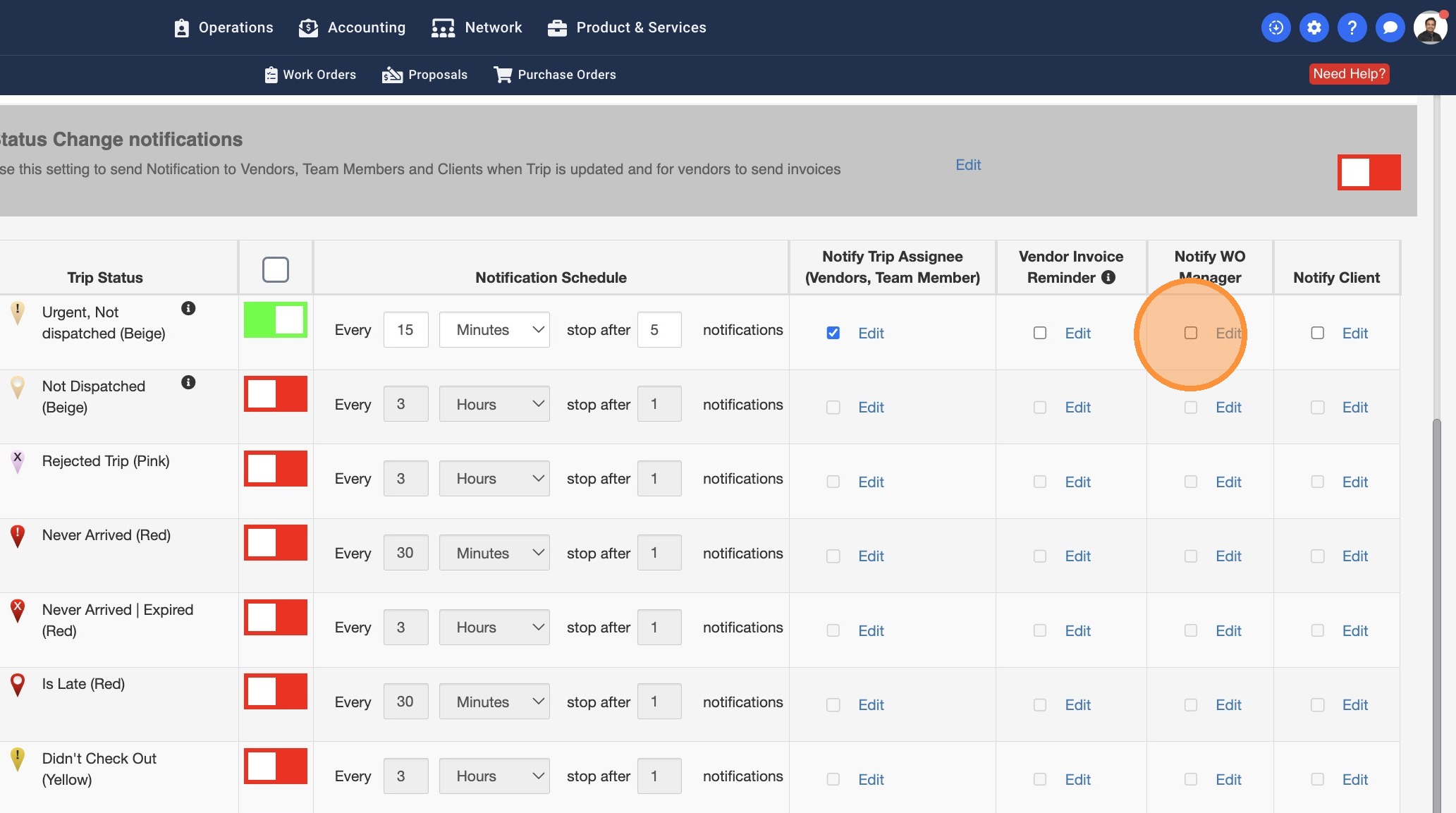 13. Some Work Orders may have a Work Order Manager assigned. You can turn this setting on to notify the WO Managers about the Trip Status