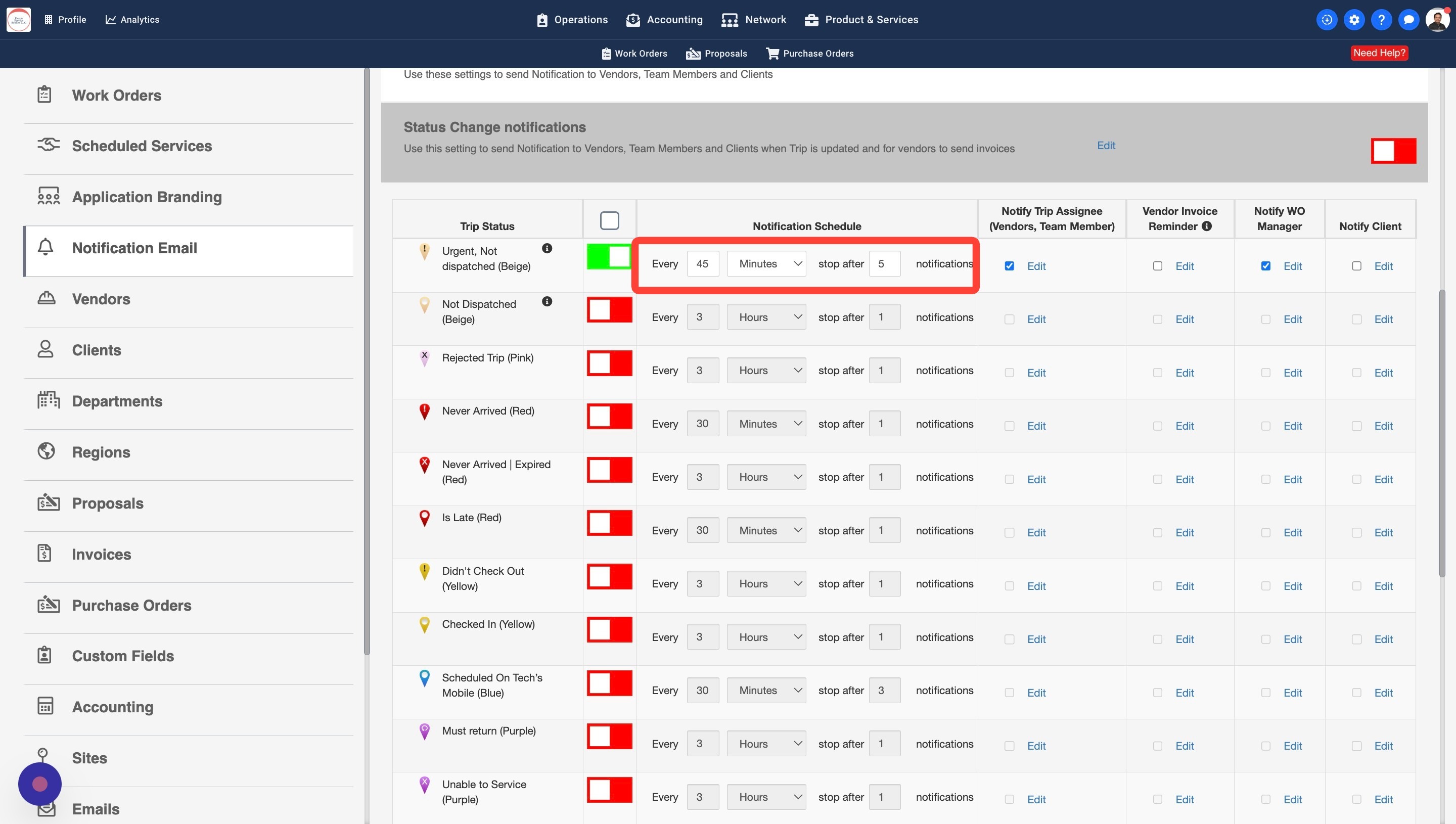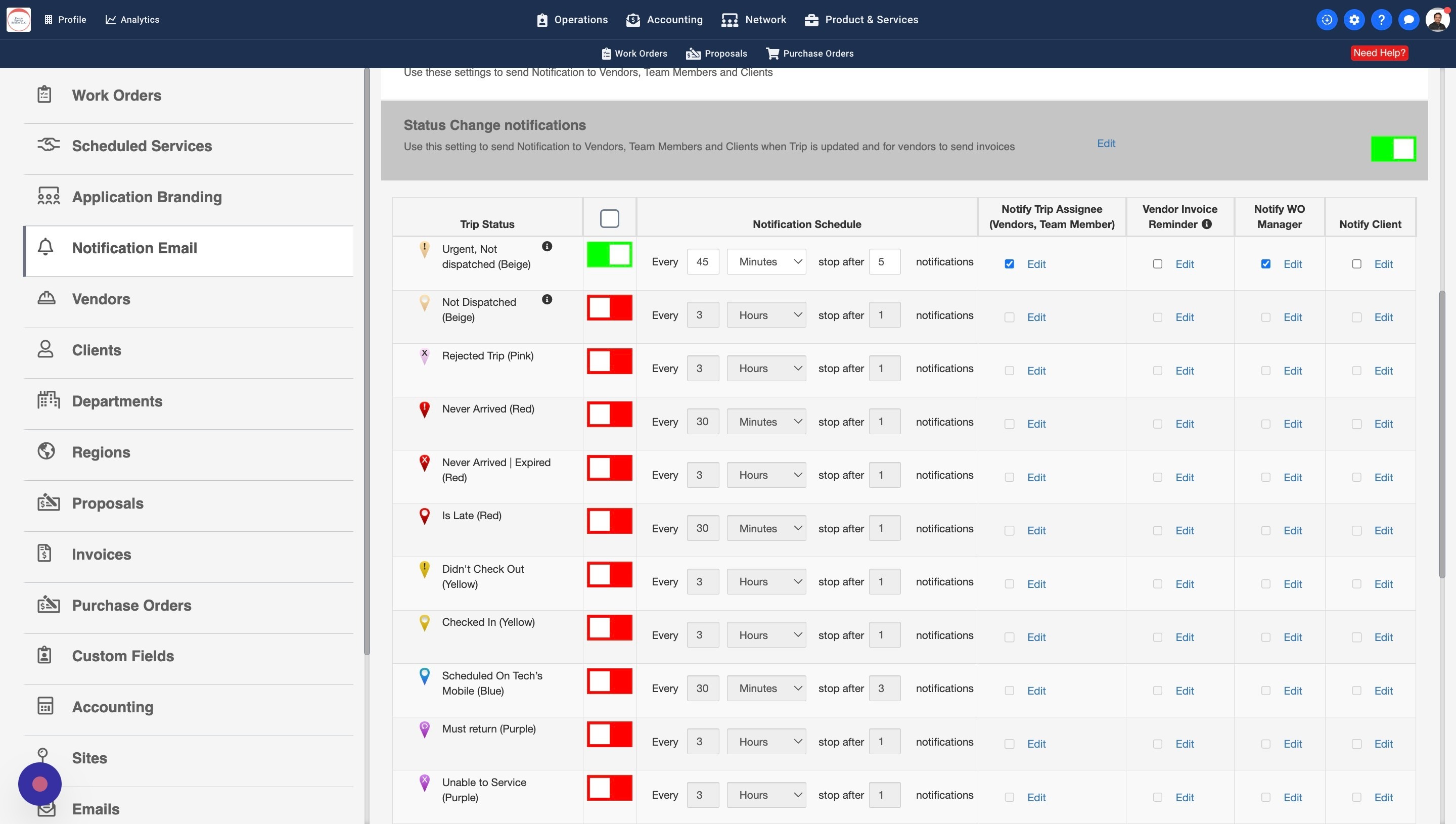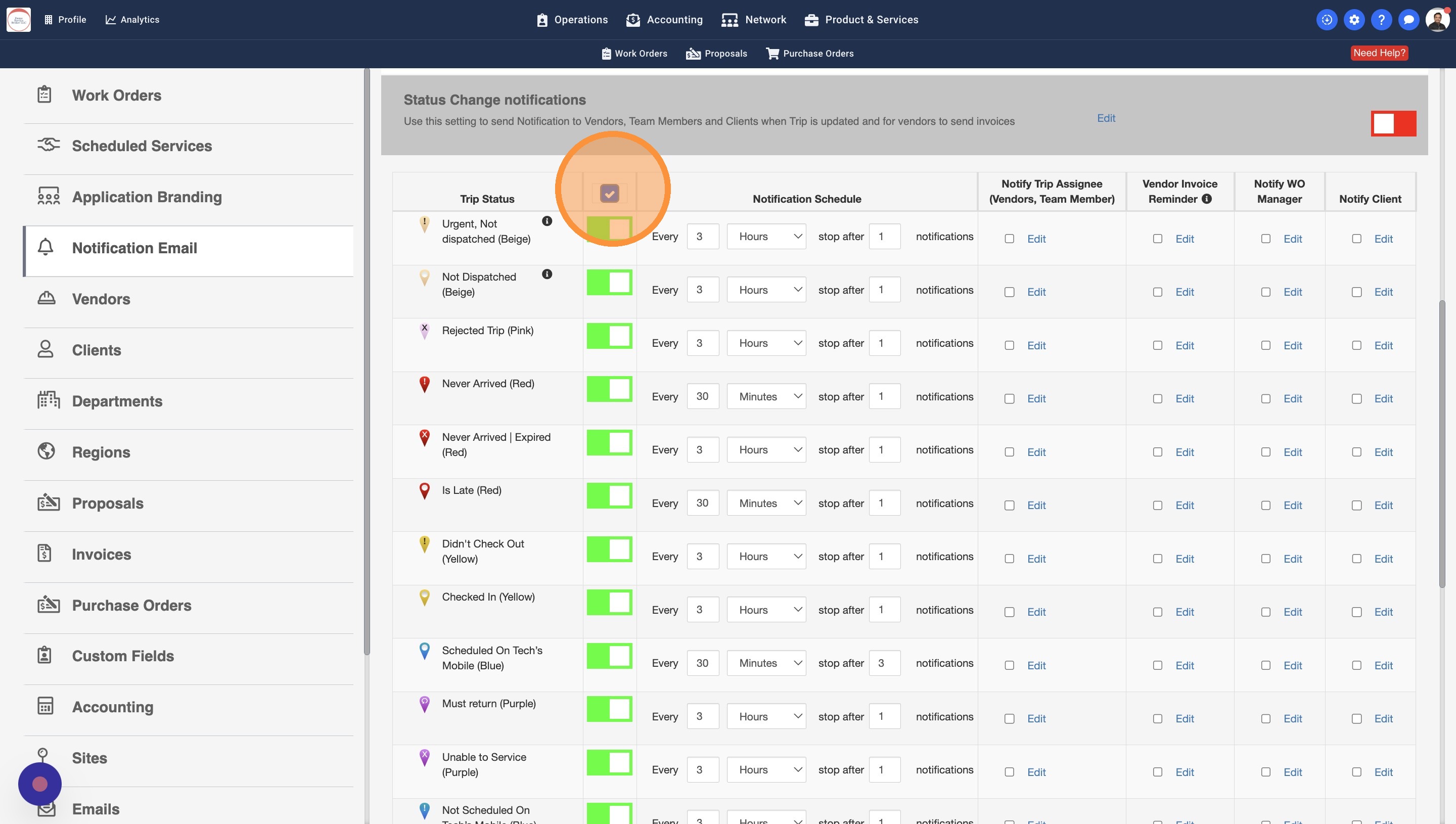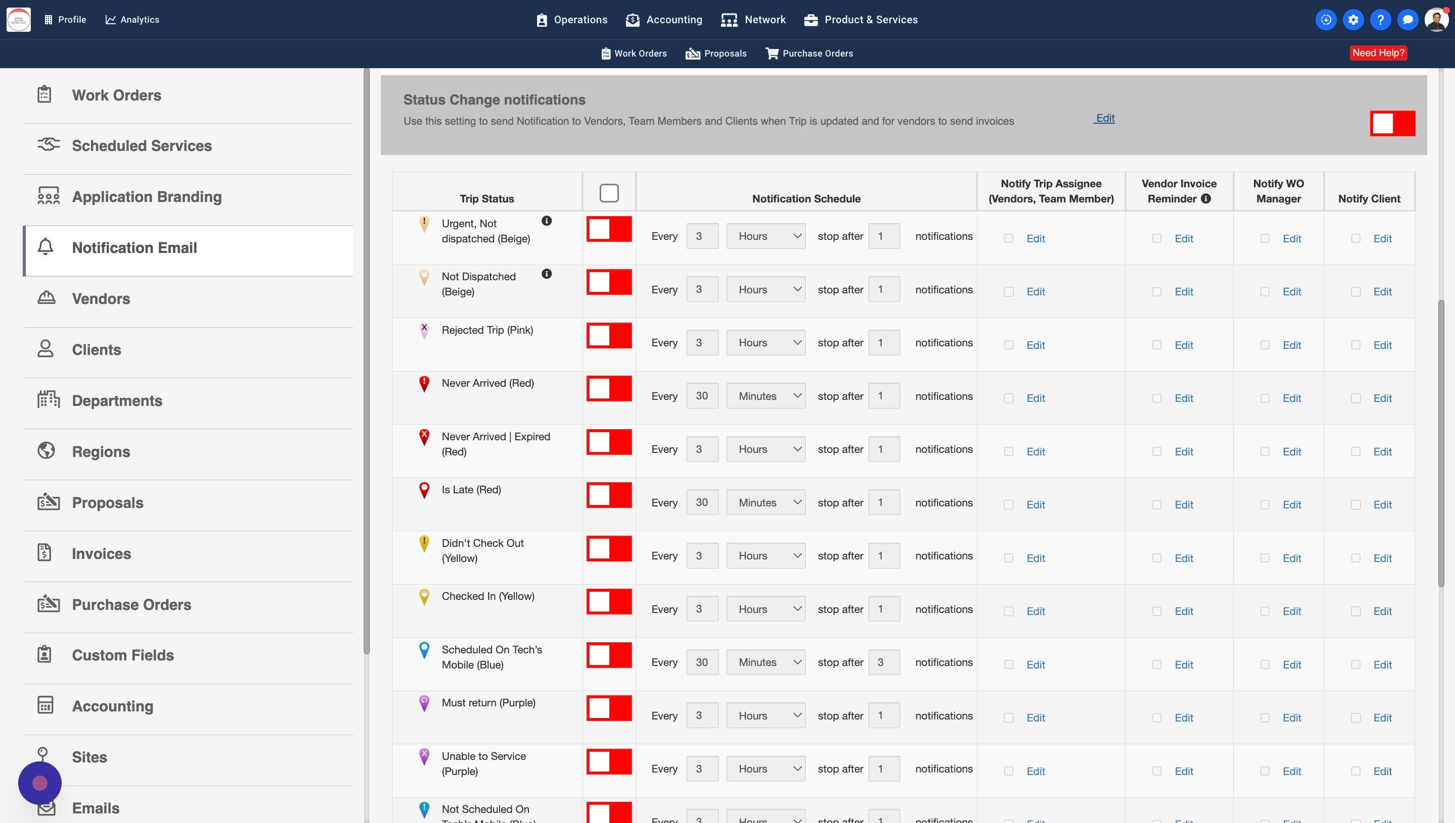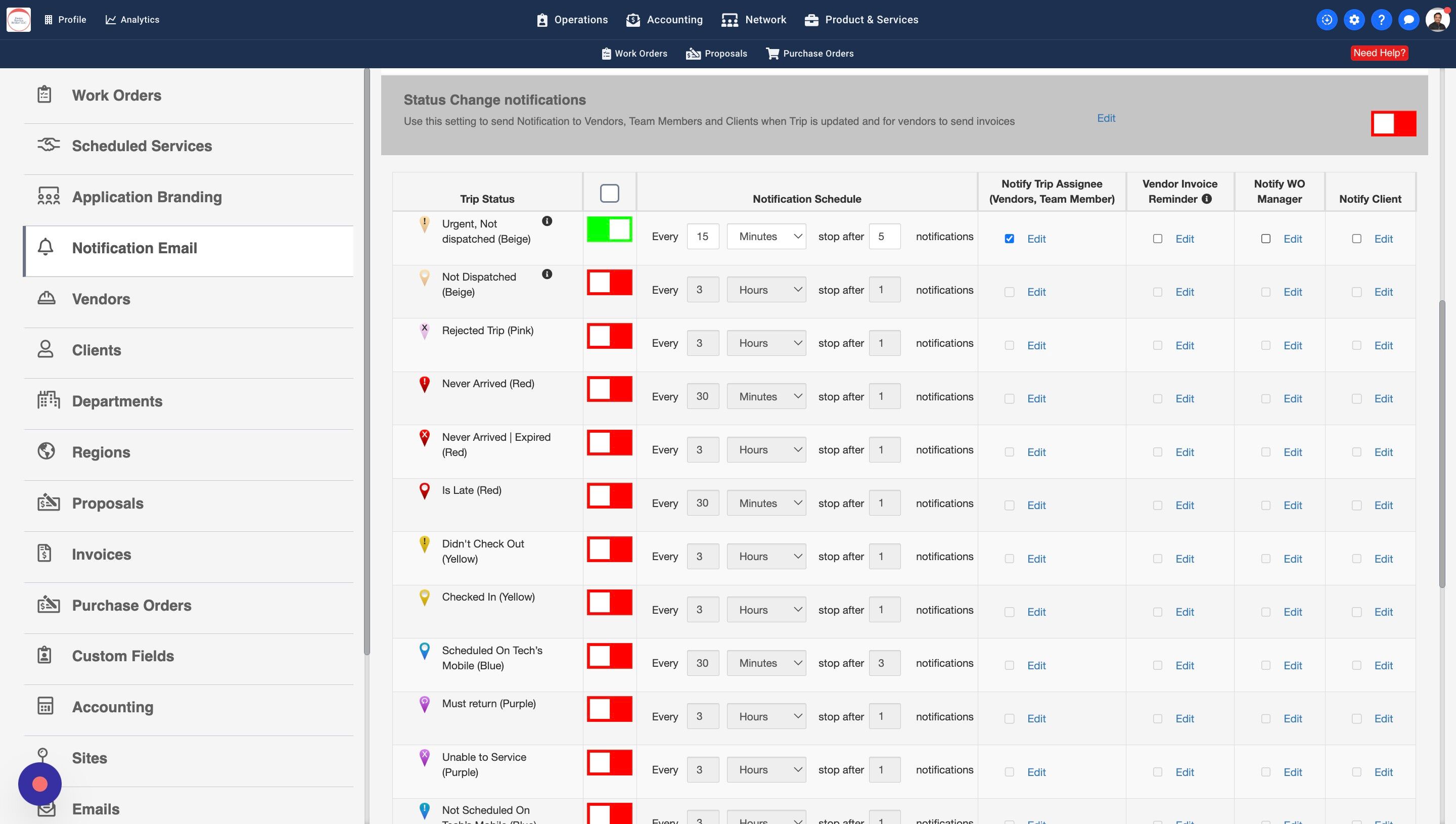 13. Some Work Orders may have a Work Order Manager assigned. You can turn this setting on to notify the WO Managers about the Trip Status
