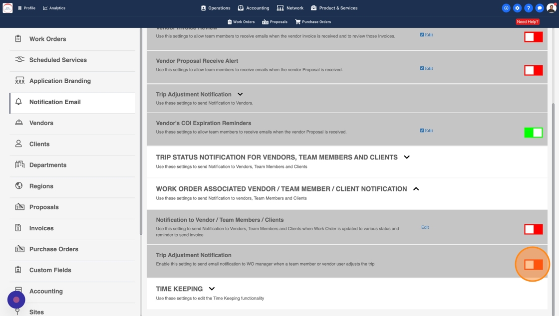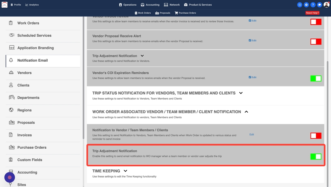 5. Turn on switch for "Trip Adjustment Notification". This will automatically send email alert to WO Manager if a Trip is adjusted internally or by a Vendor