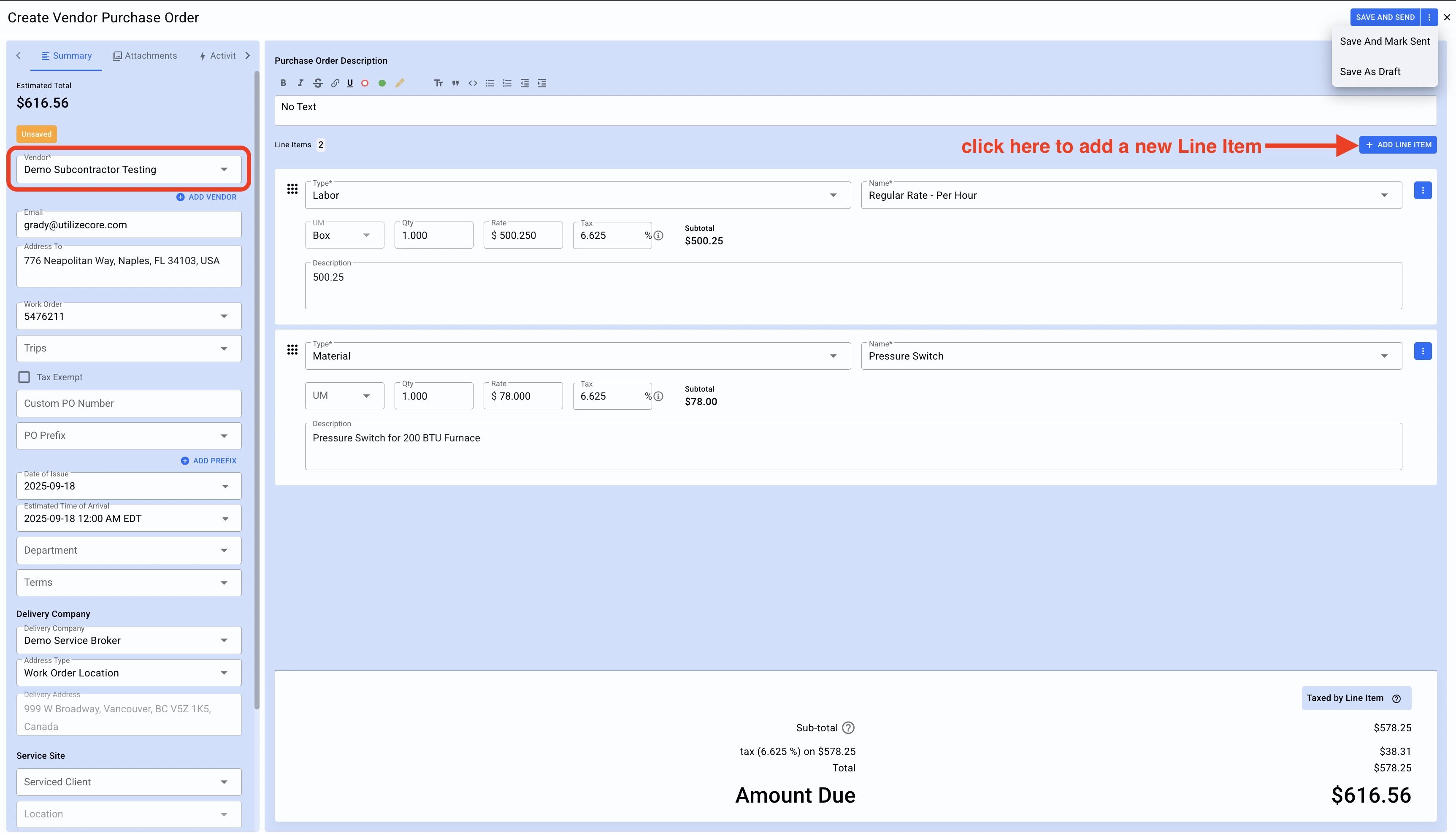 4. Select a Vendor Name in the left panel. To add new Line Items click on the blue button to the right. To save and send the Purchase Order you can click on the button on the top right corner. To select more options click on the three dots (aka more).