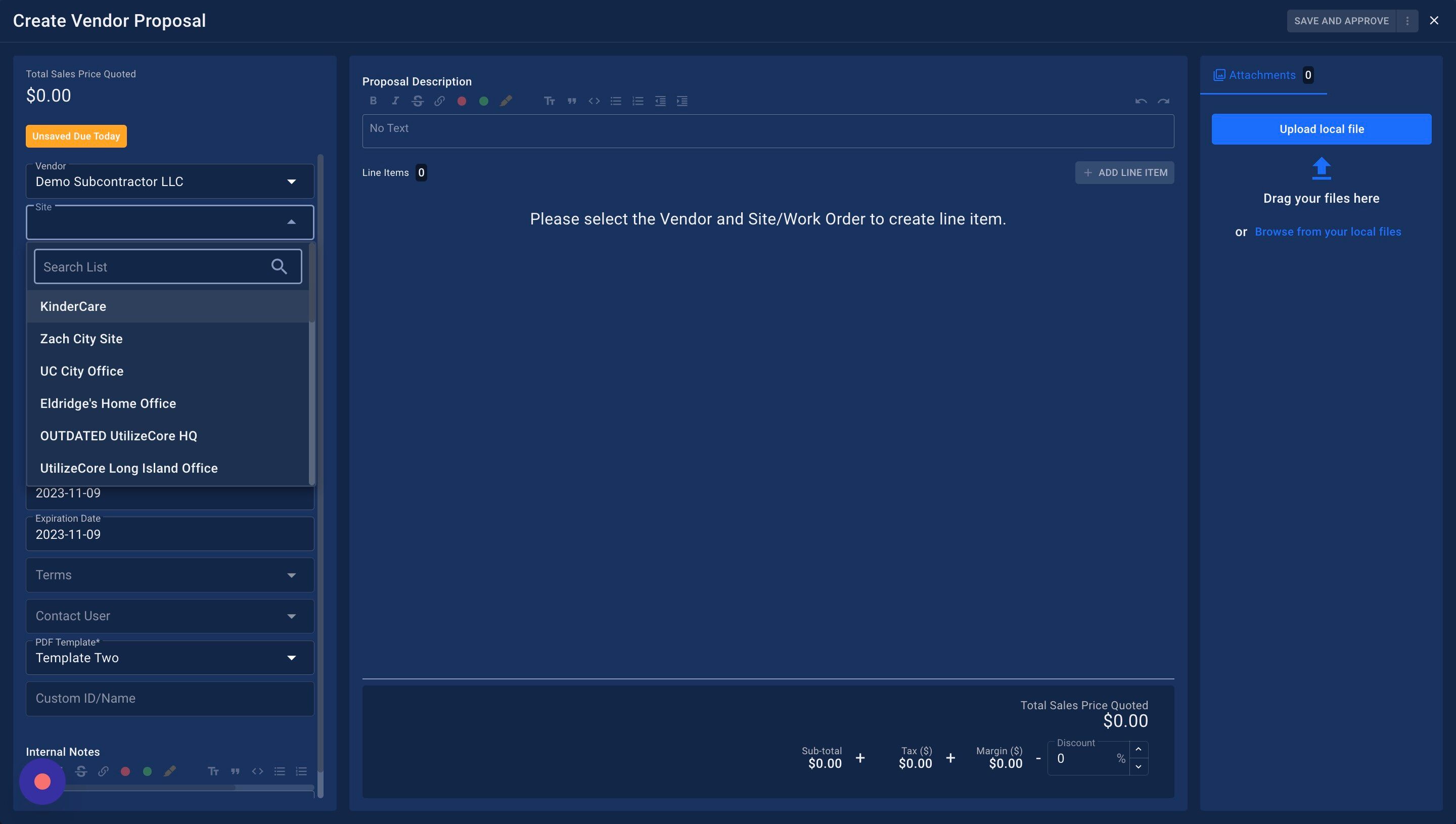 Note: It's mandatory to select a Vendor and a Site to create a new Proposal. Without selecting these two things, users will not be able to add line items or create a Proposal