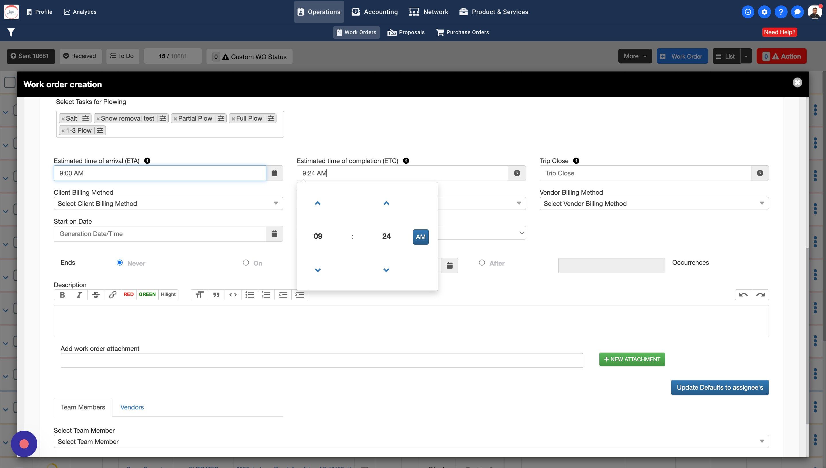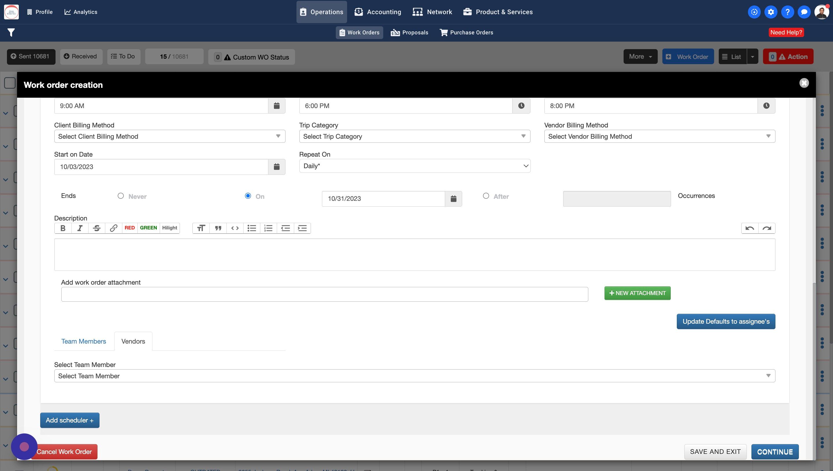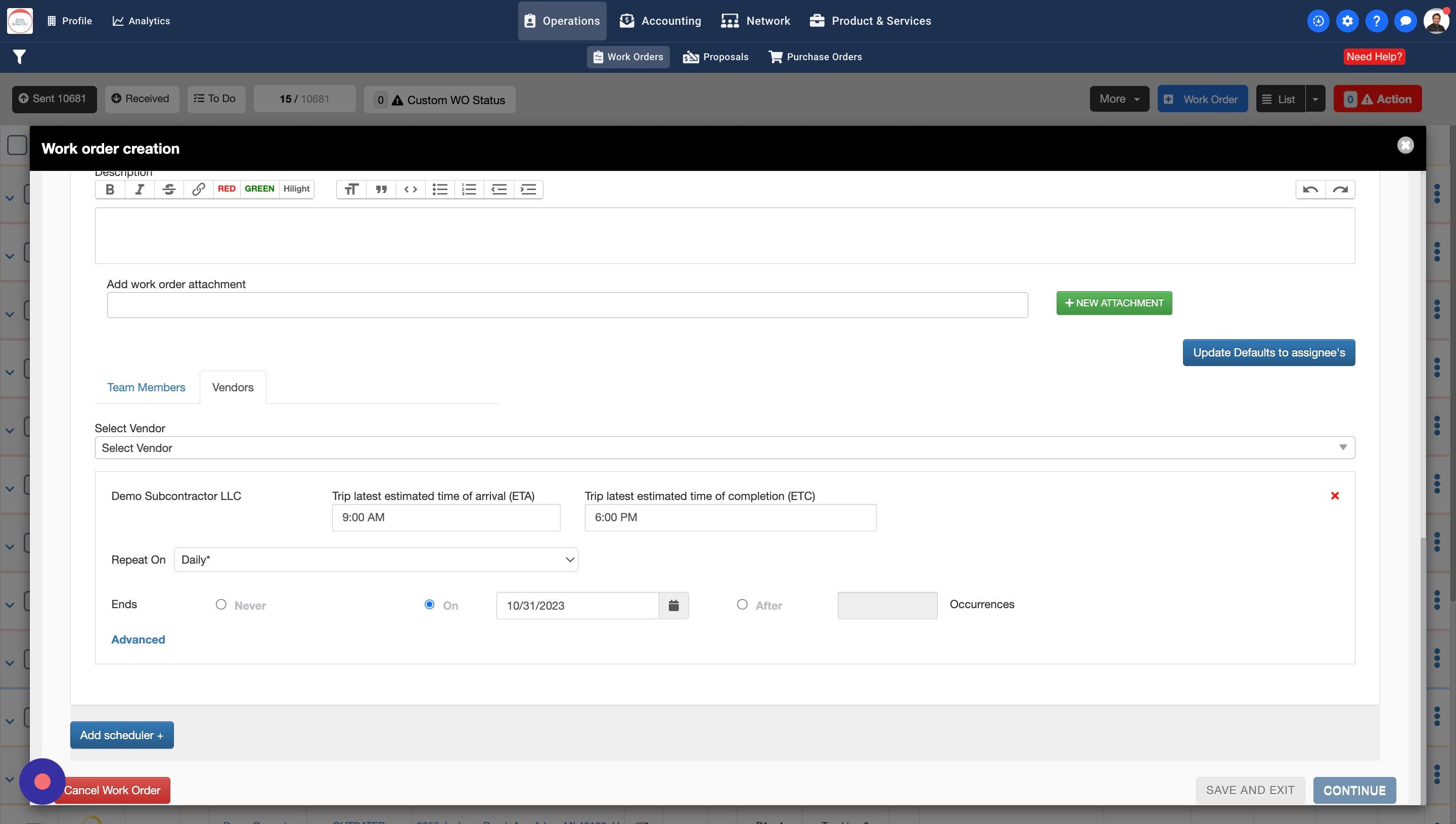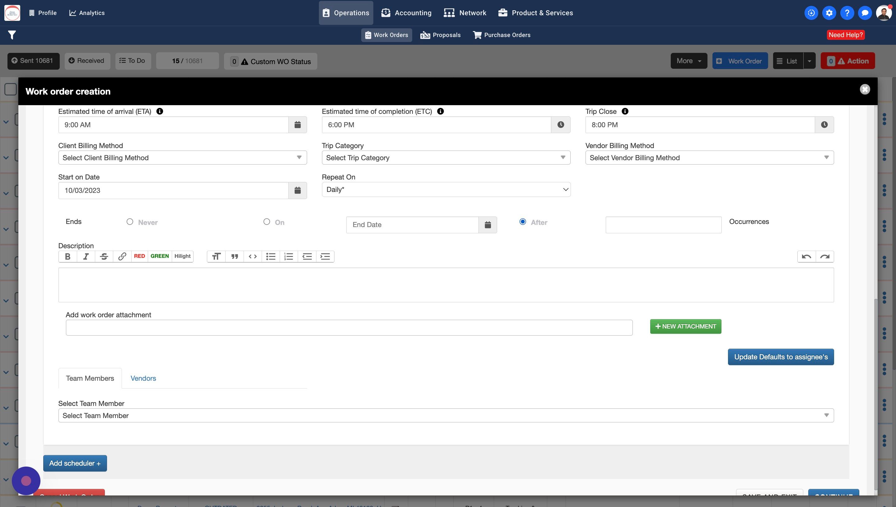 This covers everything from selecting the site, trade, and service, to setting the ETA and ETC, scheduling the trips, assigning vendors or team members