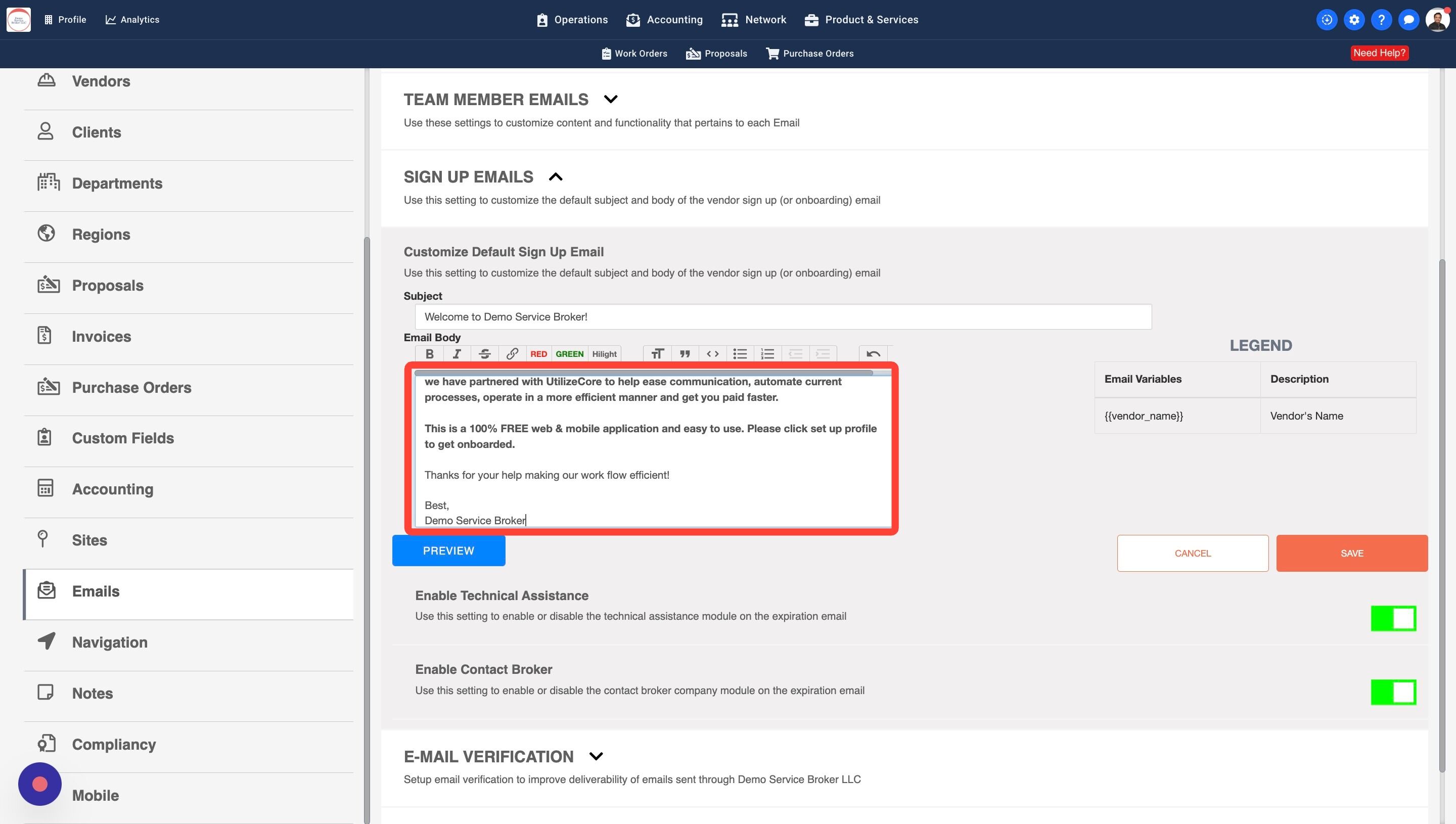 7. This is your email body text and every time you send an invitation to a new Vendor they'll see this text in your email invitation