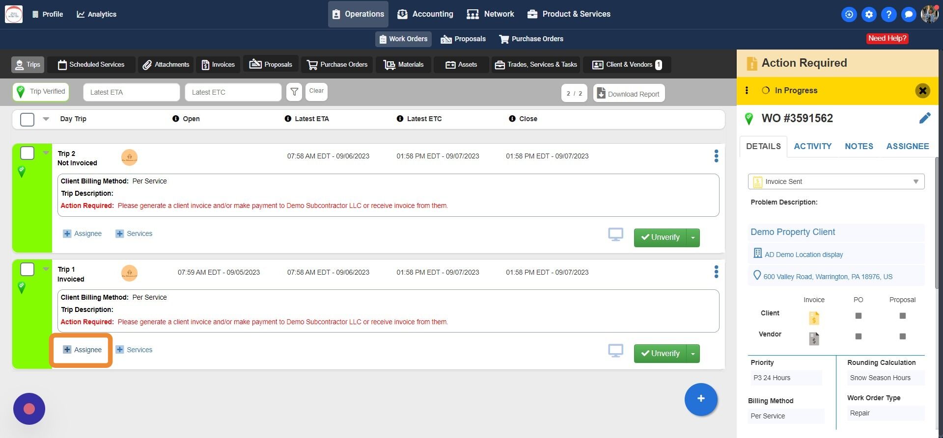 4. Click "Assignee" for the "Trip" that you want to delete the Services for