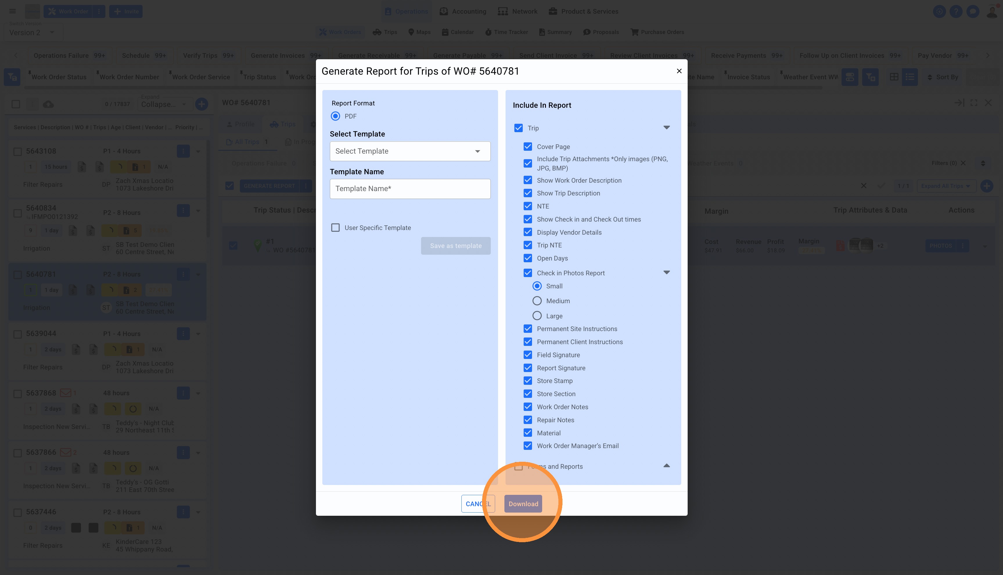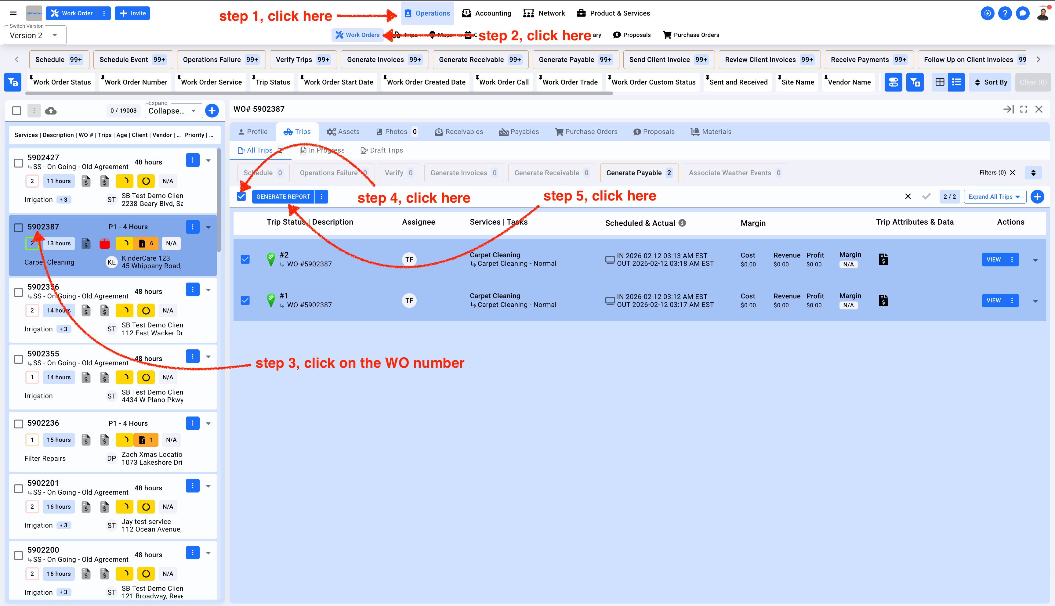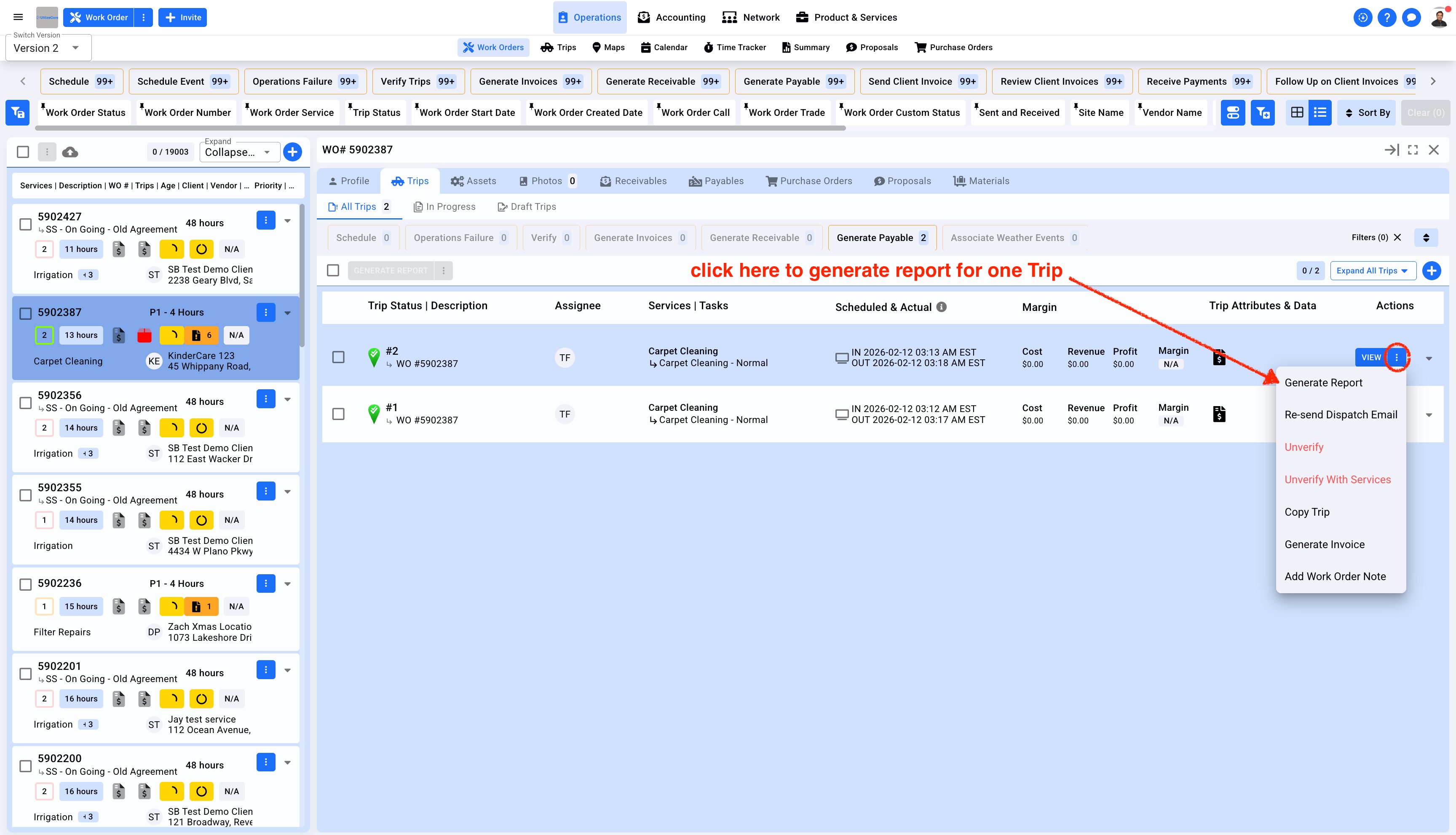 1. Click on Operations in the top center menu, select Work Orders from the sub-menu. Click on the Work Order number and this will open a details panel to the right. Select the Trip and click on the blue button Generate Report