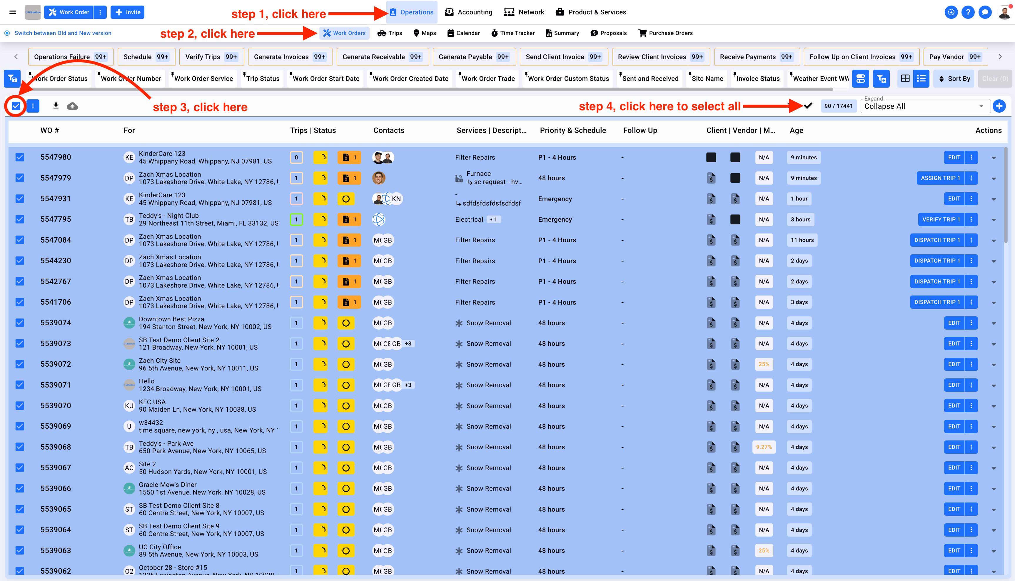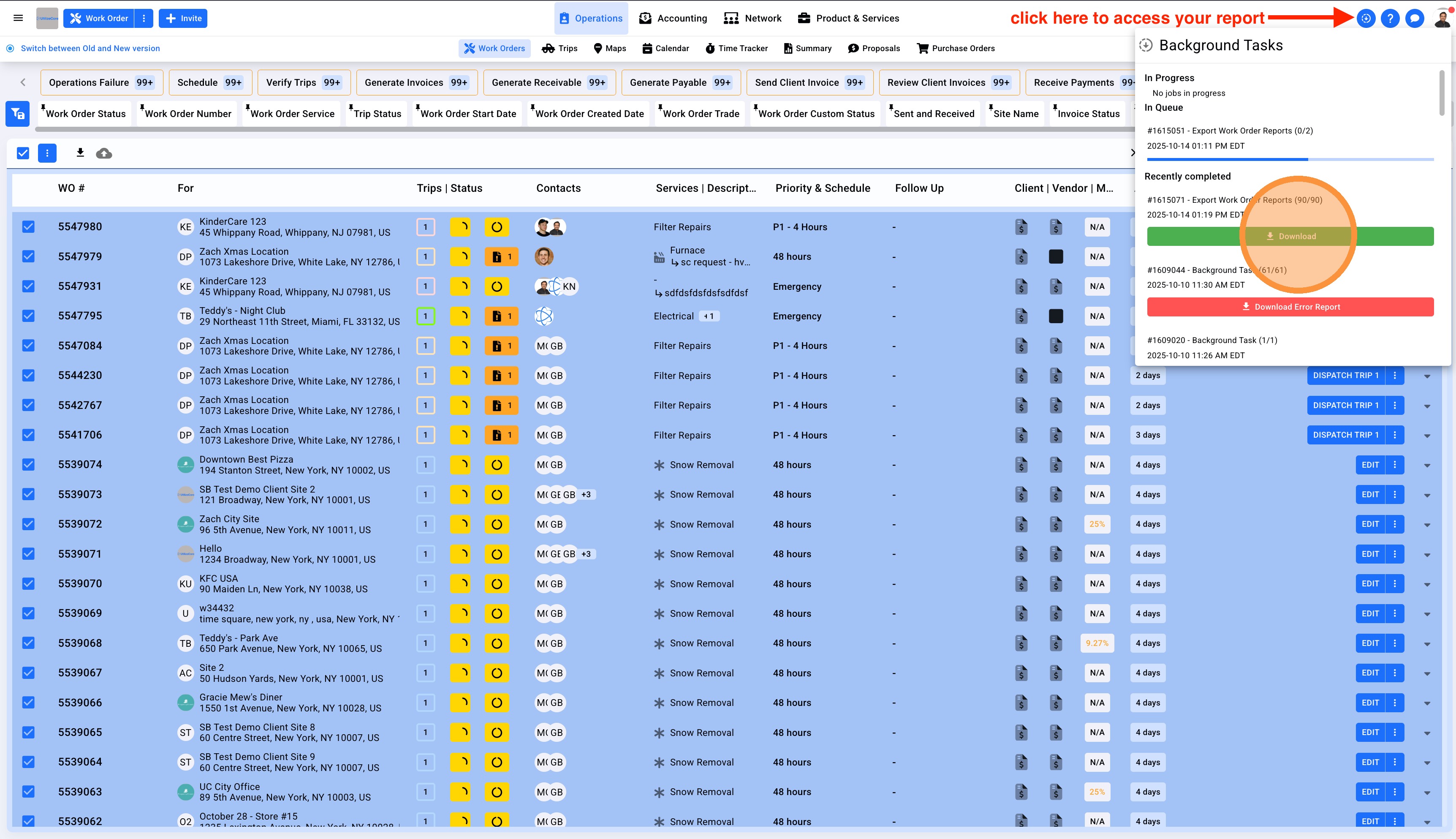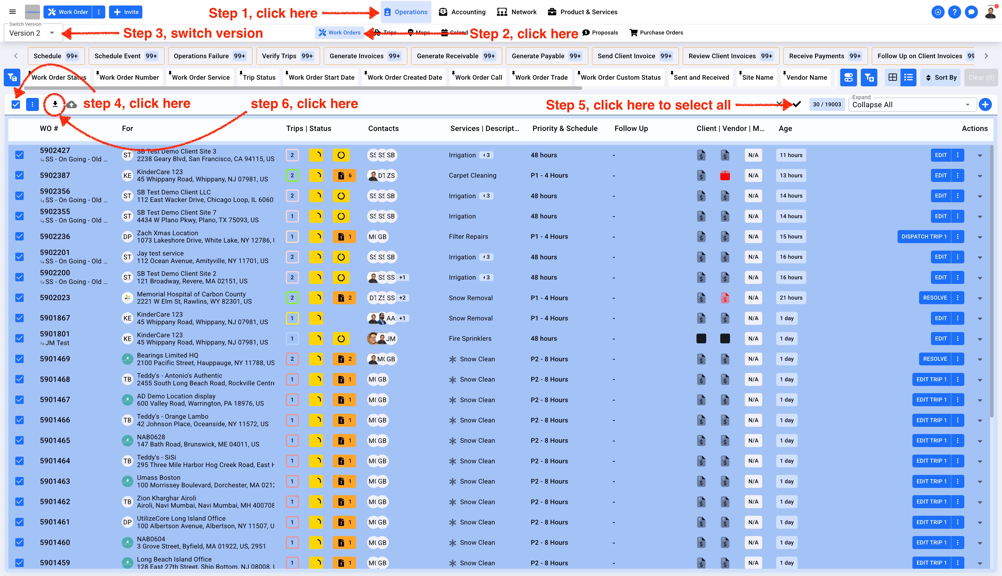 1. Click on Operations in the top center menu, select Work Orders from the sub-menu. Make sure to switch to the newer version from the top left corner. Use the filters to view the Work Orders and select them all by clicking on the main checkbox. To select all the Work Orders click on the check mark on the right. Click on the Download icon