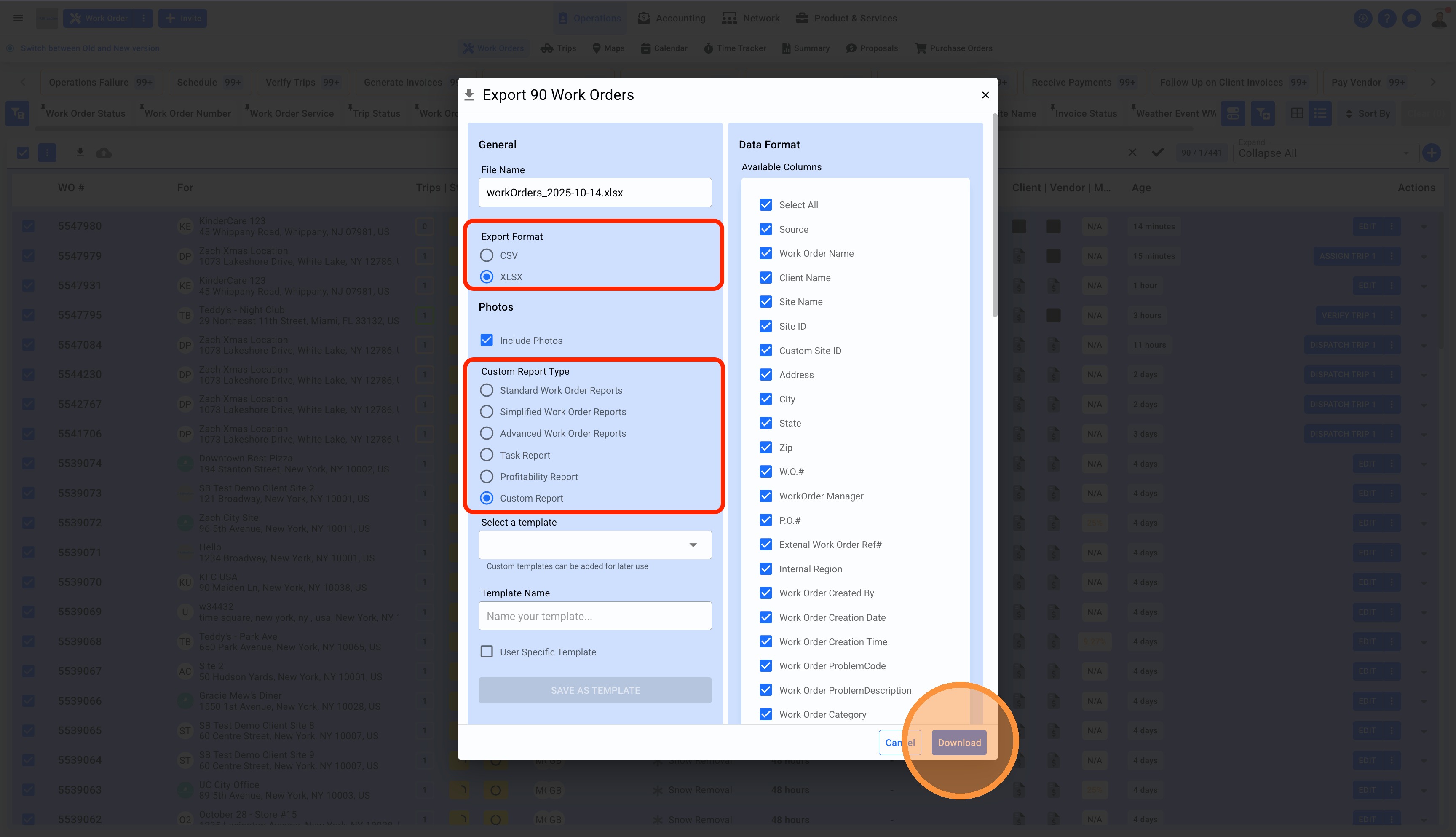2. You can select the report format and the report type. If you select Custom Work Order report type, you can select the Work Order report columns manually from the right panel and click on the blue button Download