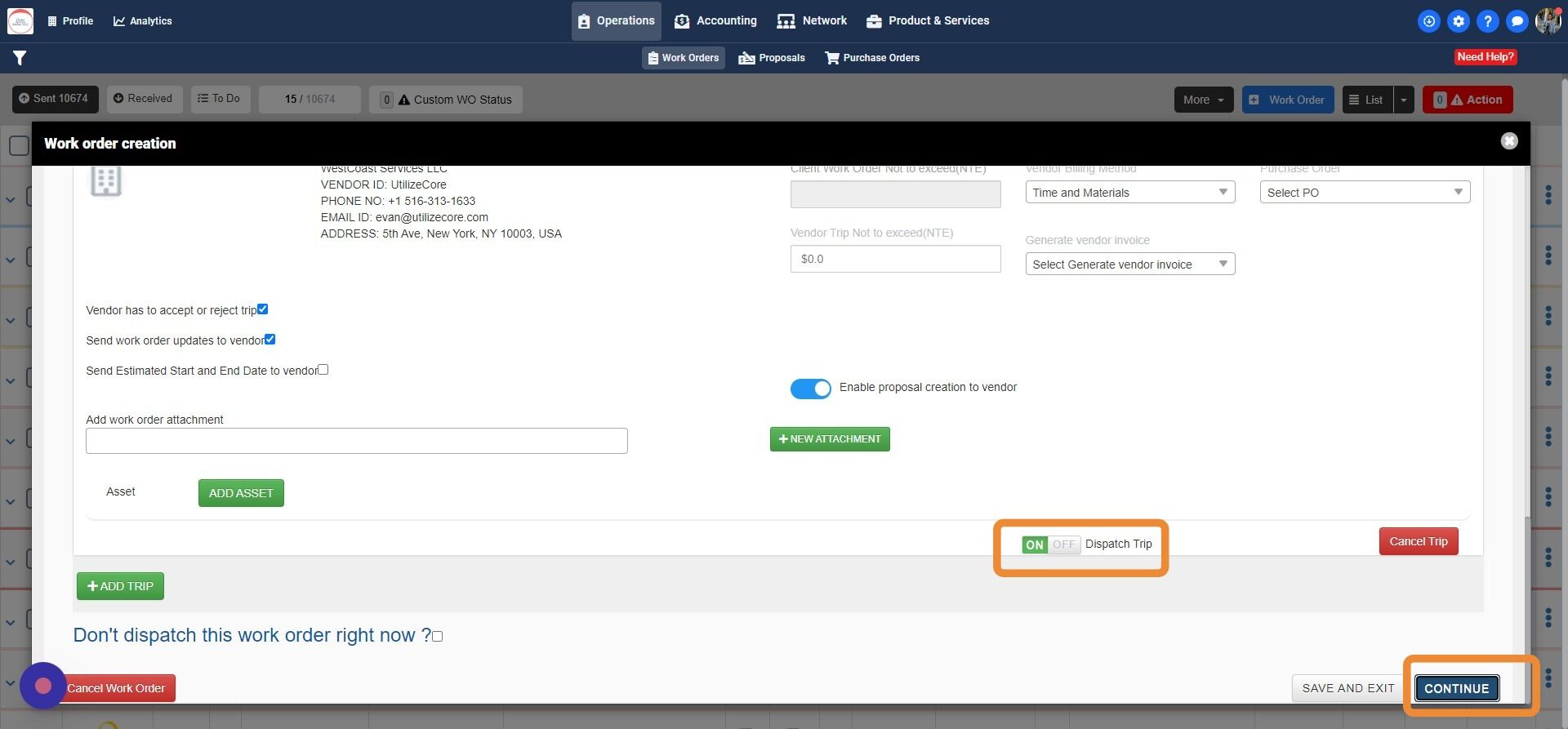 Click on "ON" for "Dispatch Trip" and Click on "Continue"