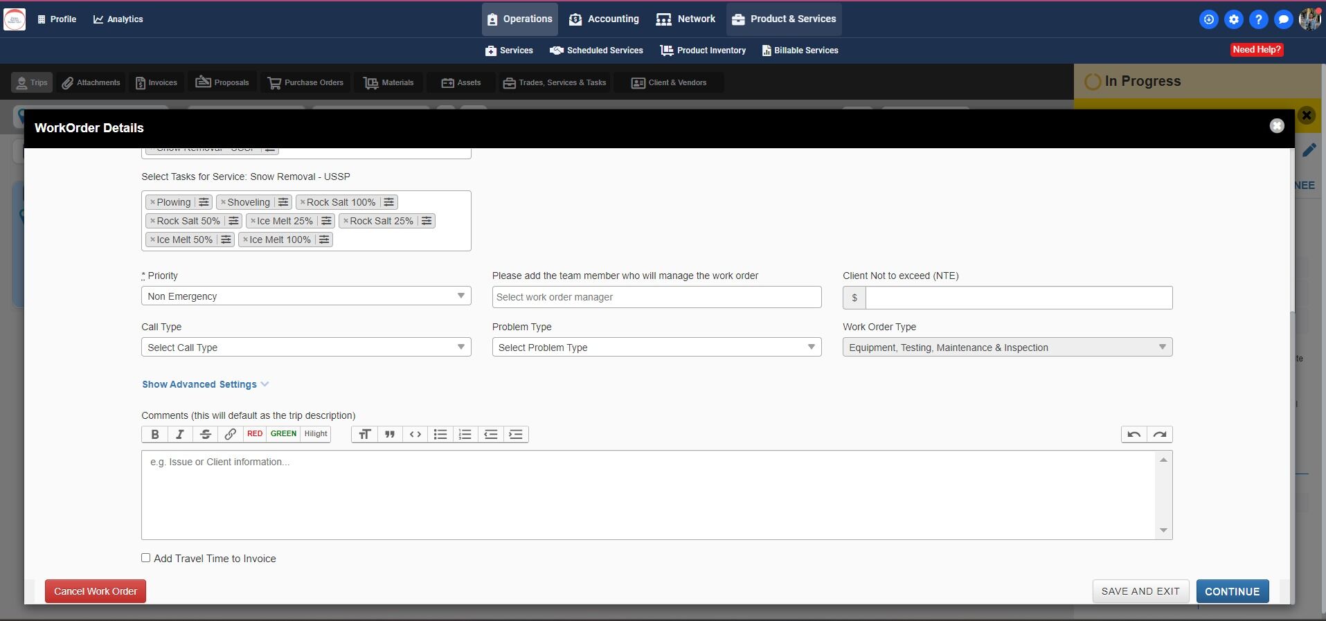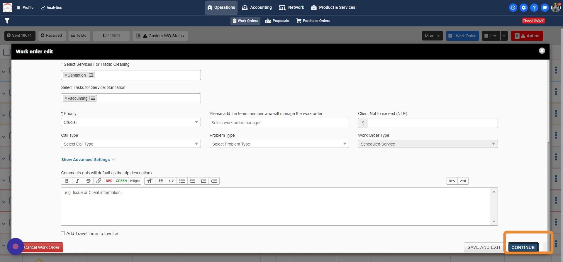 5. Make all the changes on the "Work Order Edit" page and then Click on "Continue"