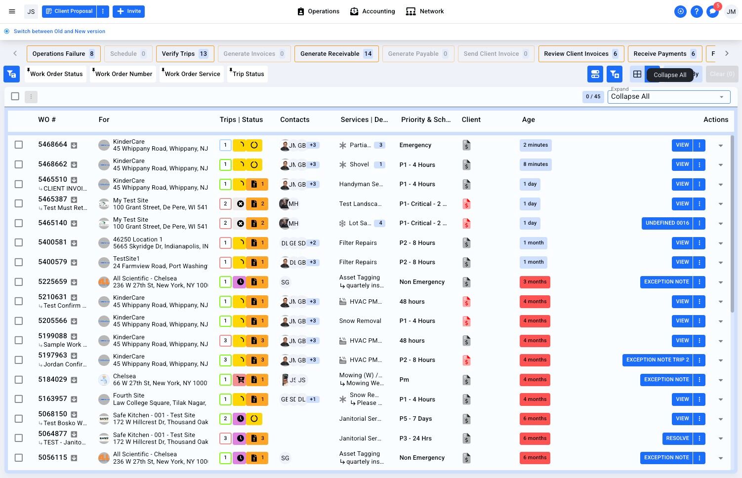3. Click the "Operations Failure" Action Filter to quickly sort to show only Work Order and Trips requiring manual intervention.