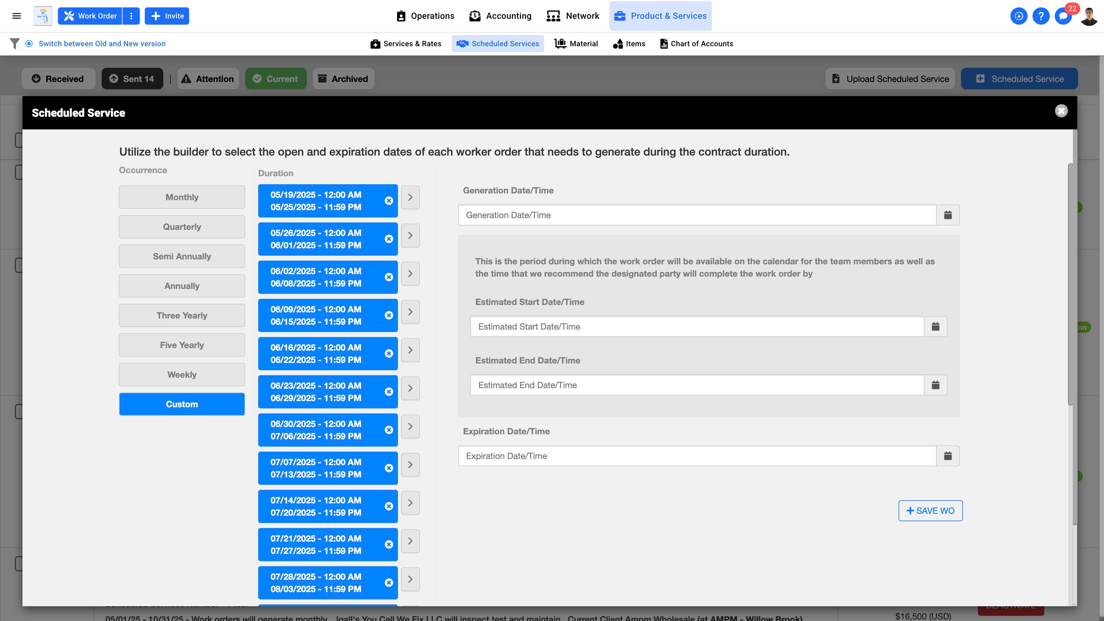 15. Click "Custom" to see the Work Order frequency configuration.