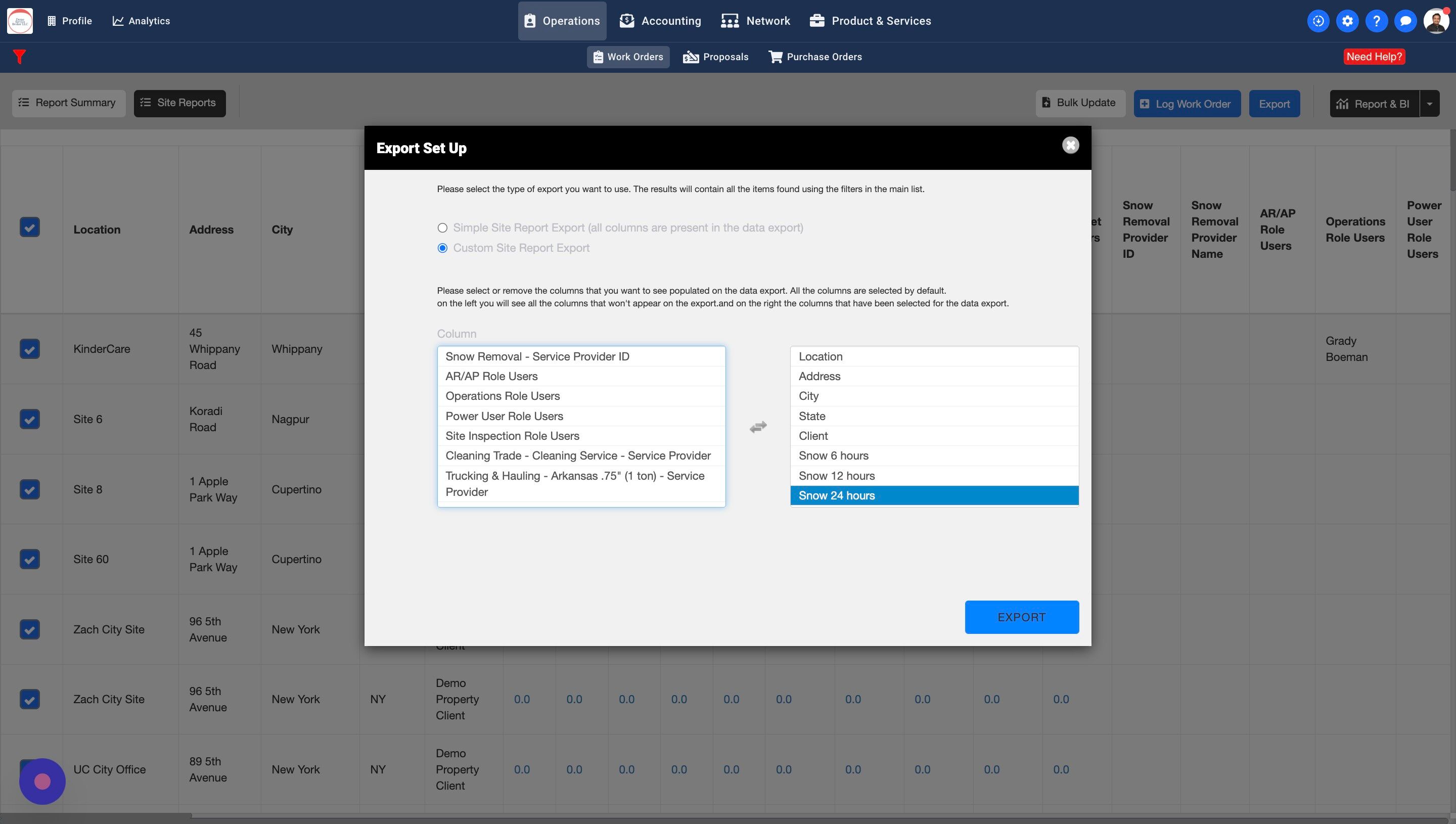 5. You should see a modal pop to select your report type. If you select a Custom Site Report Export you can choose between which columns you want in your report.