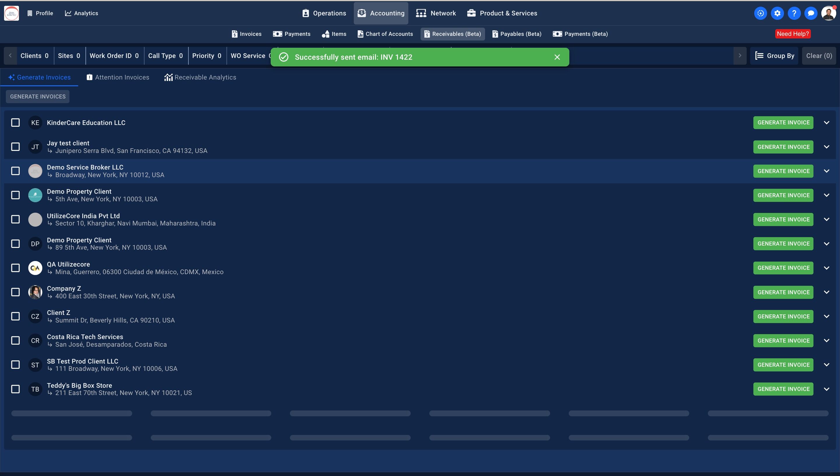 7. Click "GENERATE INVOICE", you can also click on "Generate Invoice" at Client, Site, or Work Order level too.