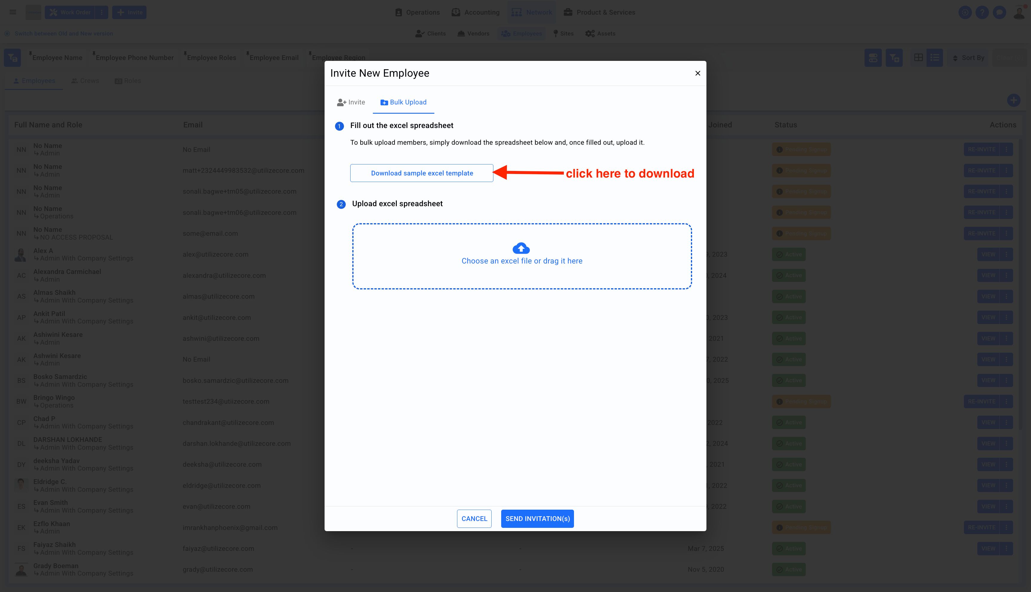 2. Click on the Bulk Upload tab and download a Sample Excel Template and fill all your Employee details such as their First & Last Names, Emails & their Roles
