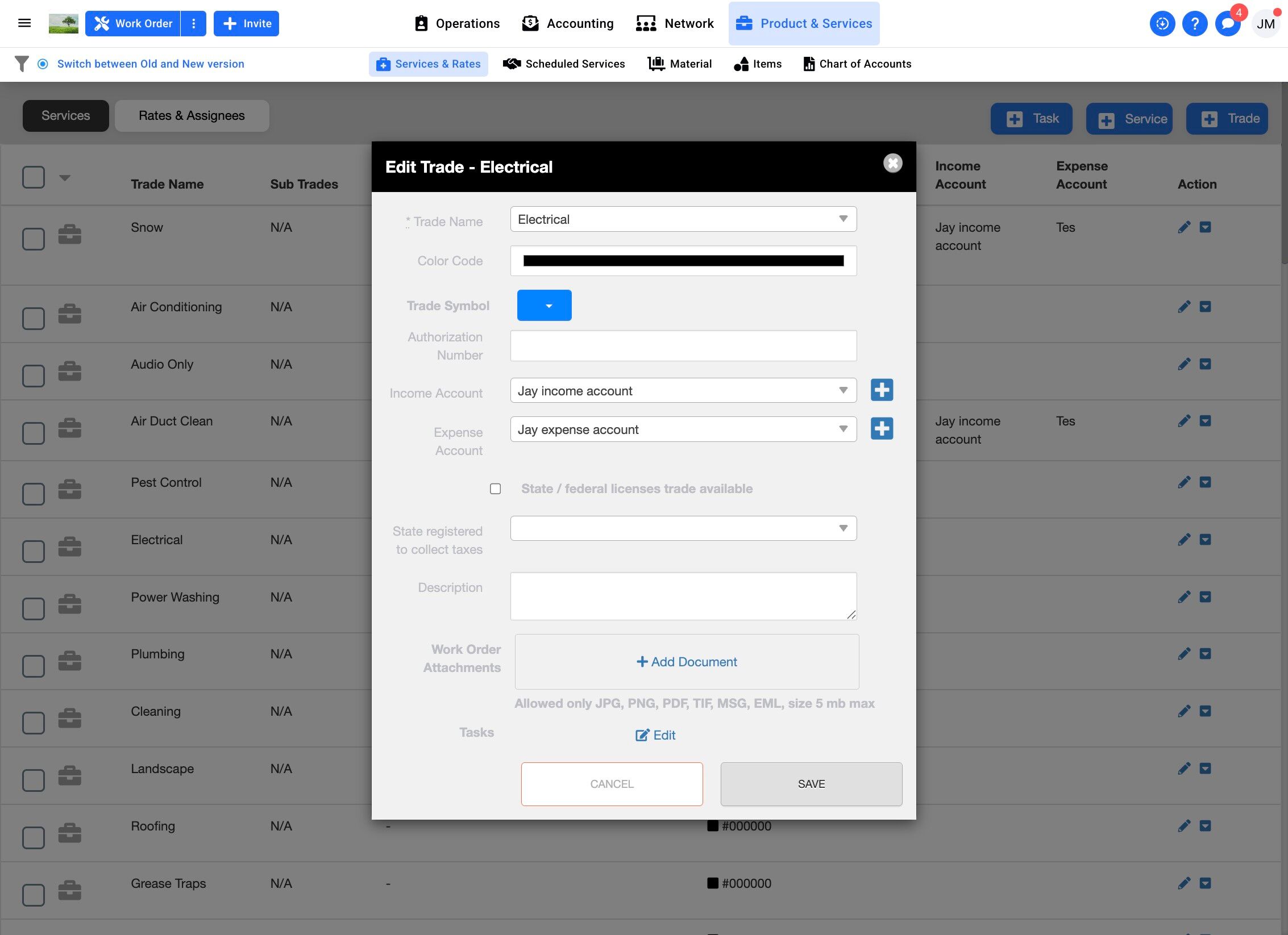 Whether setting up your Services for the first time – or updating mappings your Accounting integration – you can set your default Income Account and Expense Account for each Trade and Service.