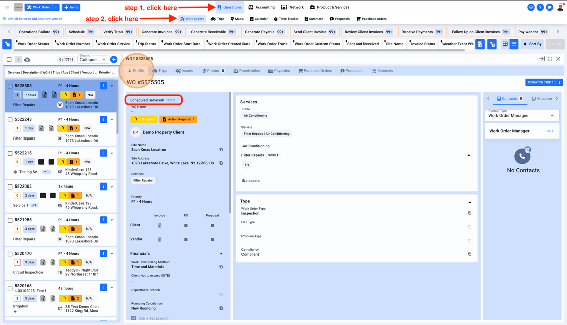 1. Click on Operations in the top center menu, select Work Orders from the sub-menu. Click on the Work Order number and a detail panel will open on the right side. Click on the Profile tab