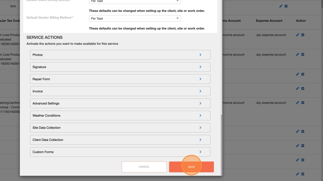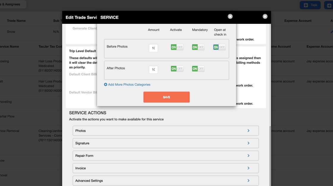 12. If you want your technician on site to upload Before Photos as soon as they he/she checks in to a Trip, click "ON" under the column "Open at check in"