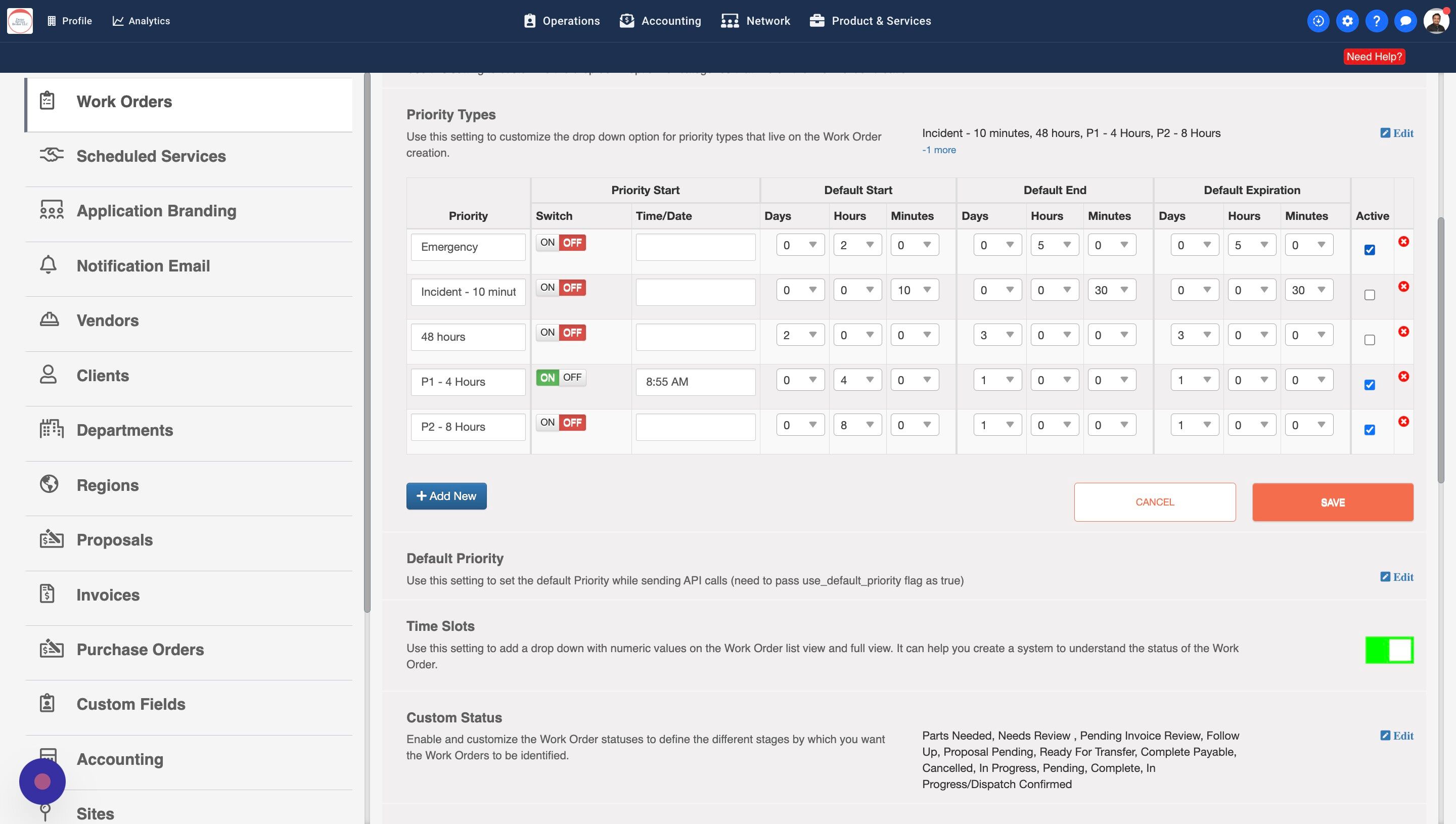 You can customize the priority types, and set default start, end, and expiration times for work orders.