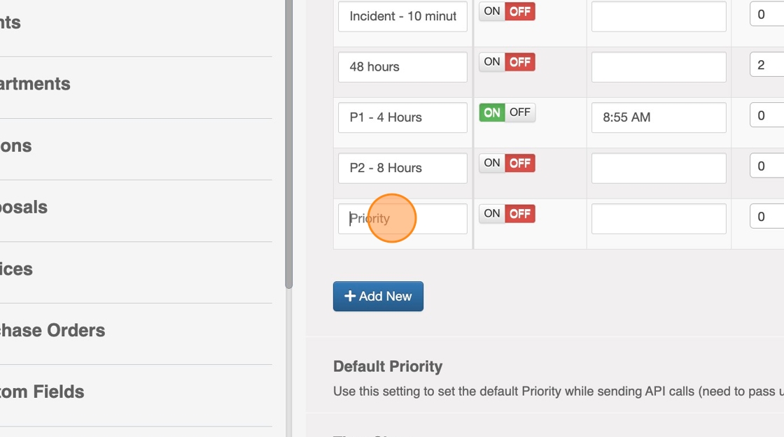 8. Turn the switch "ON" and enter a Time in the next field. Every time this Priority is selected while creating a new Work Order the Priority Start will be calculated based on the time you put in this field.