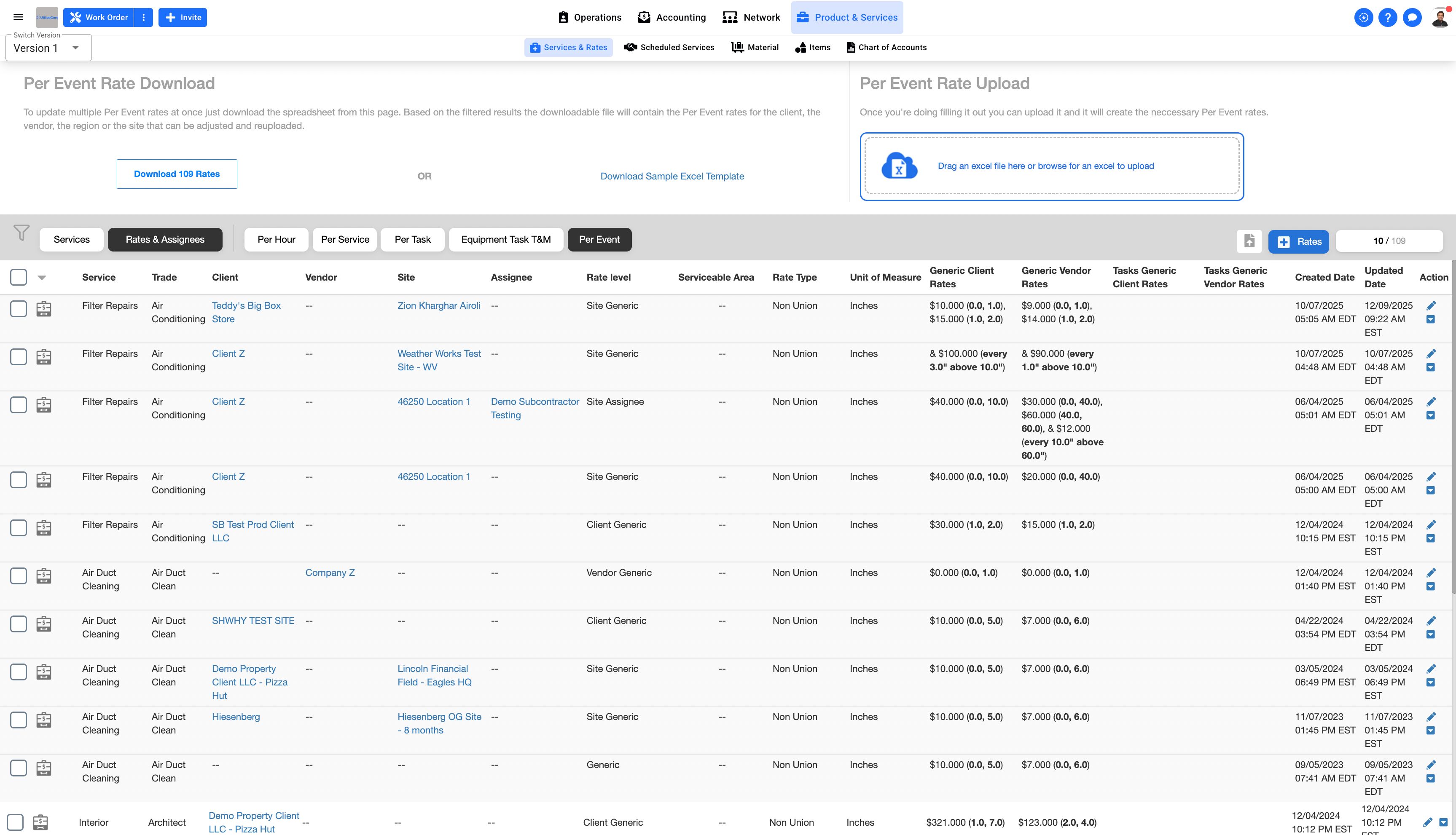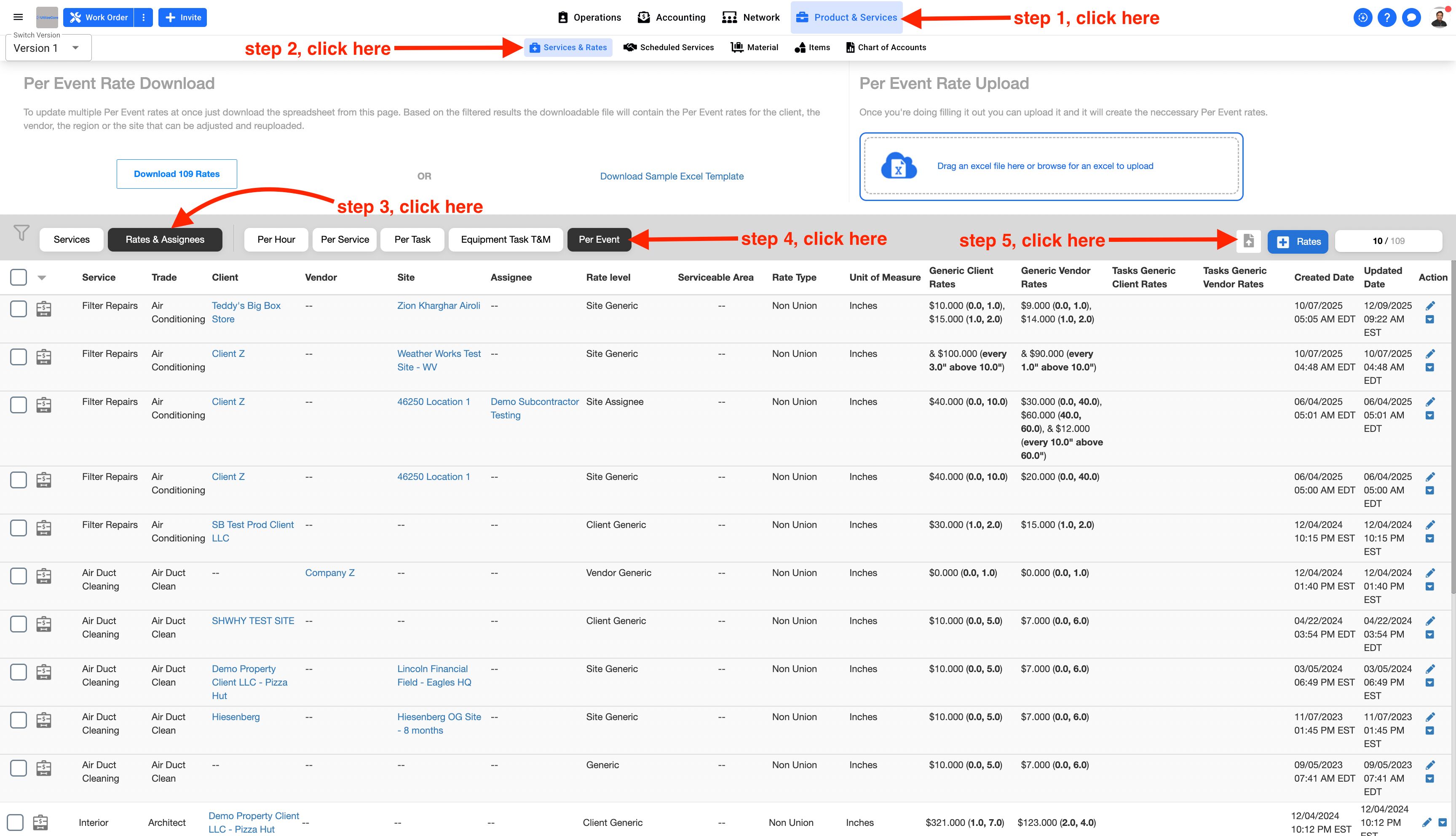2. Click on Products & Services in the top center menu, select Services & Rates from the sub-menu. Click on Rates & Assignees tab and select the Per Event tab. To upload your file click on the cloud icon on the right side.