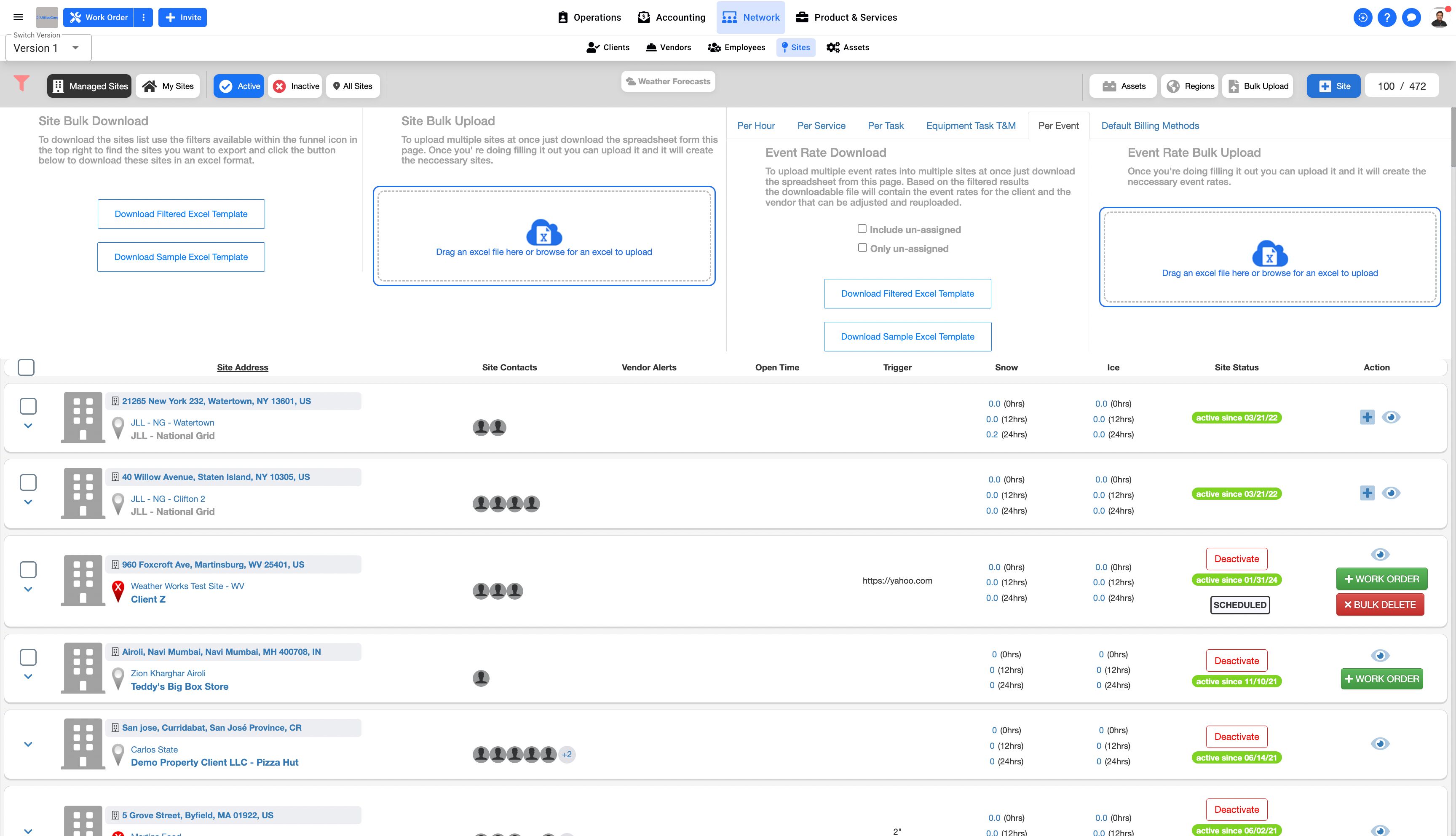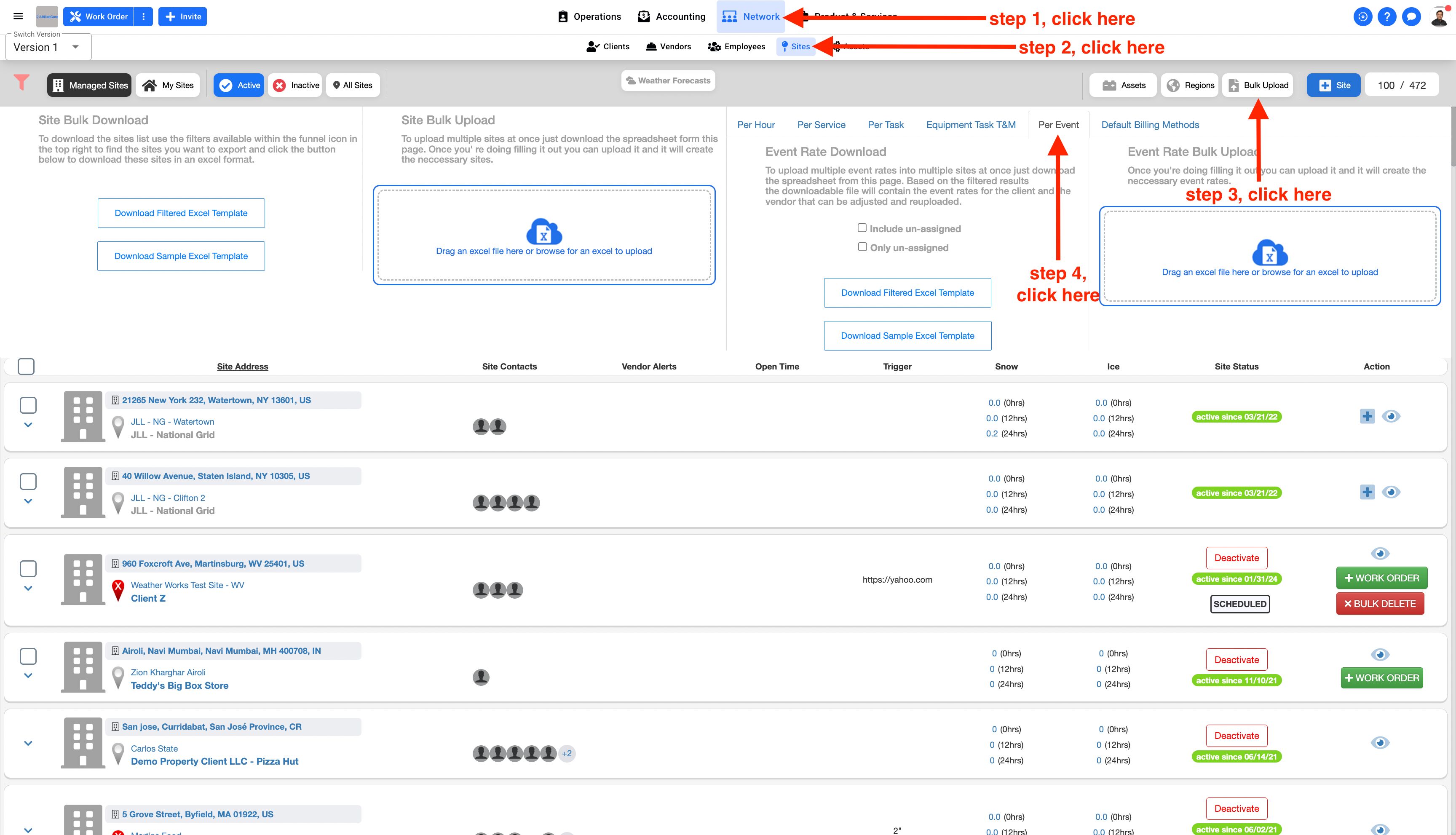 1. Click Network in the top center menu and select Sites from the sub-menu. Click on the Bulk Upload button on the top right and select the Per Event tab. To upload your file click on the cloud icon on the right side.