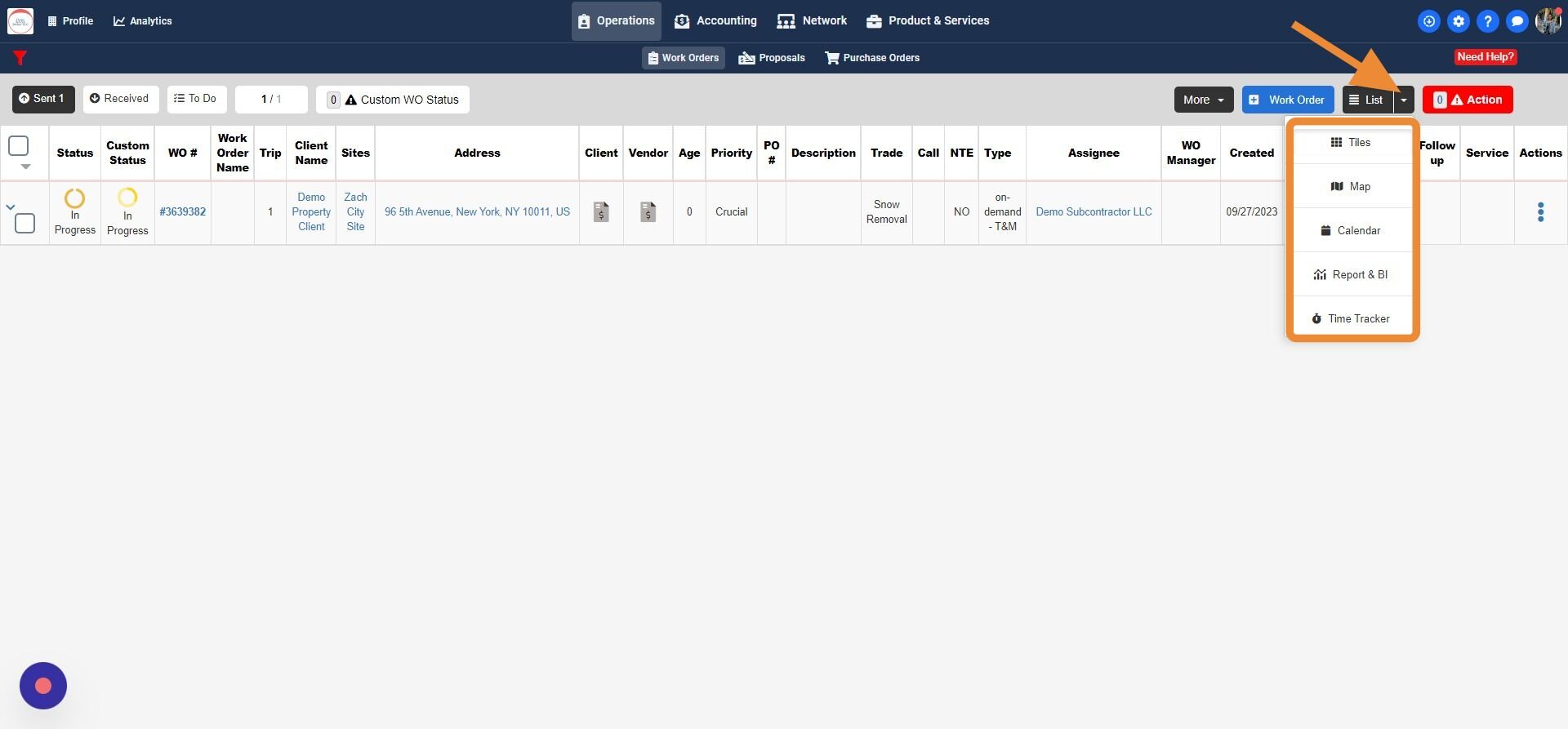 9. Please click on the arrow sign to view the Work Order in different forms such as "Tile" view, "List" view