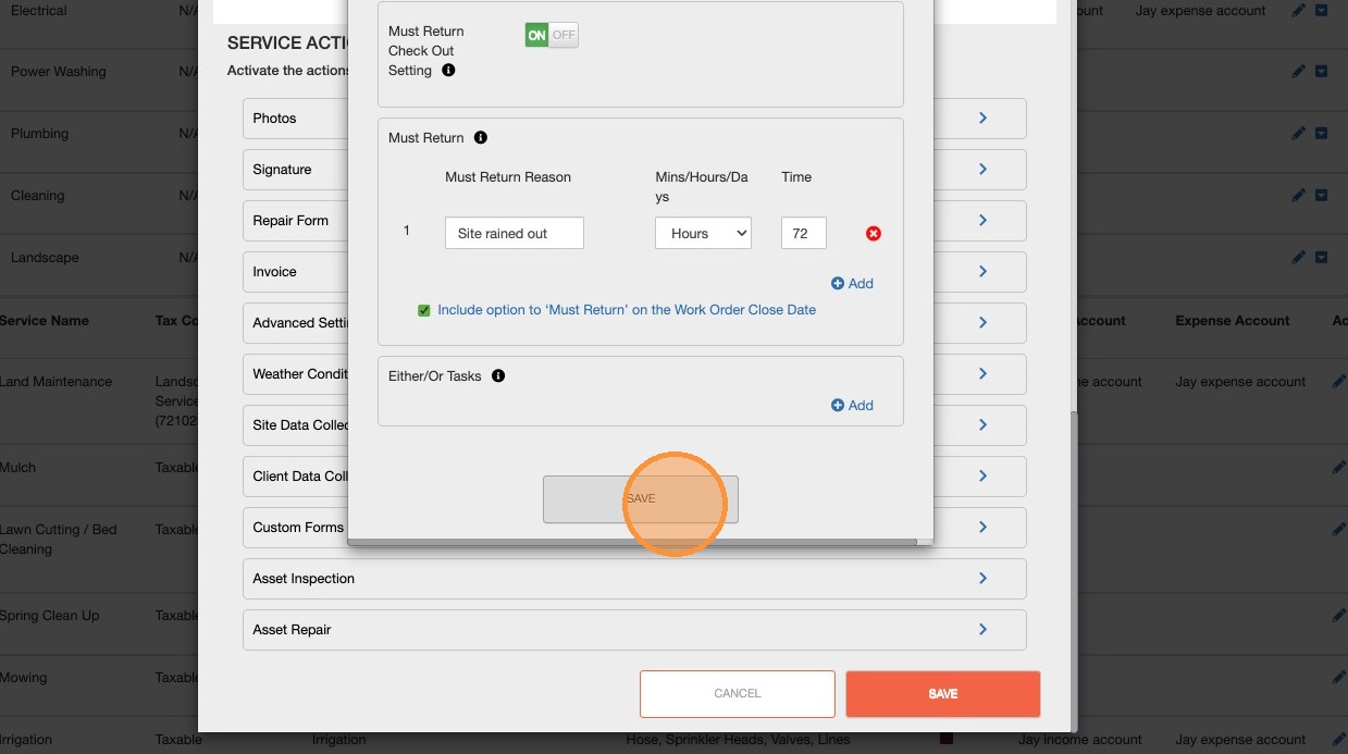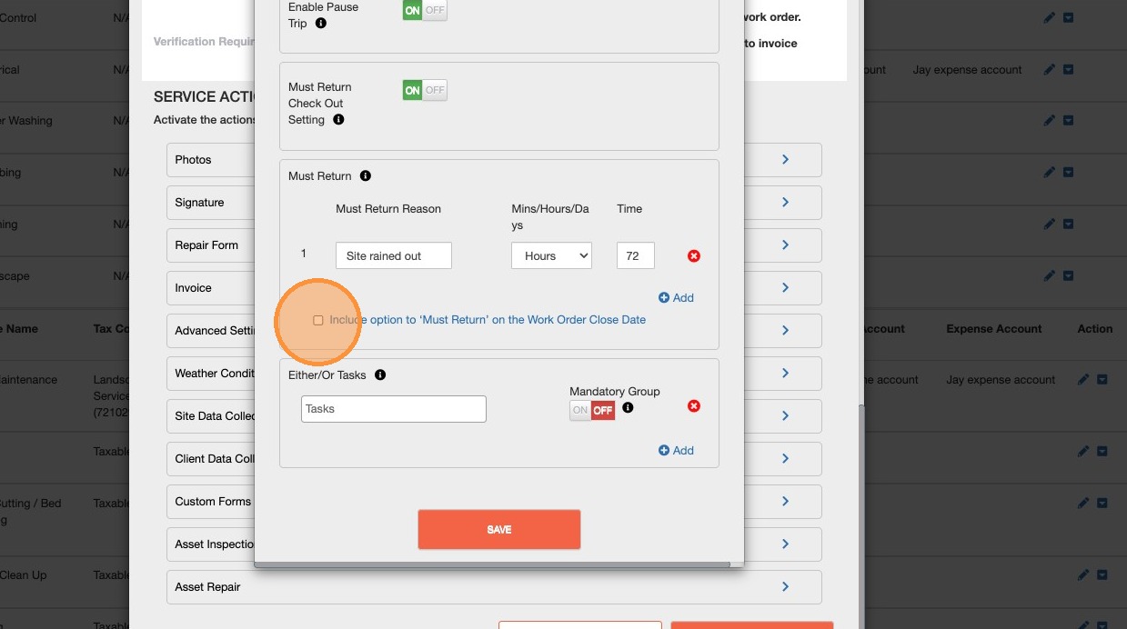 5. Within the 'Must Return' section, you can select the checkbox stating "Include option to 'Must Return' on the Work Order Close Date"