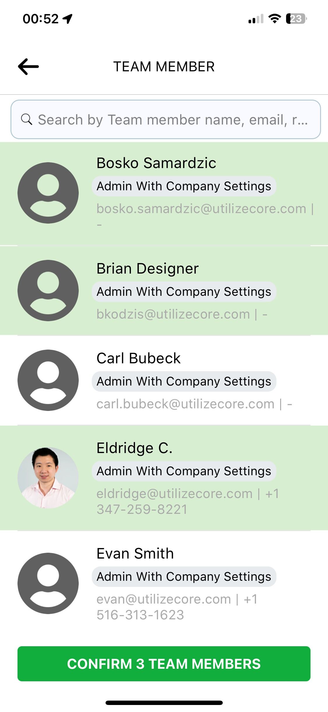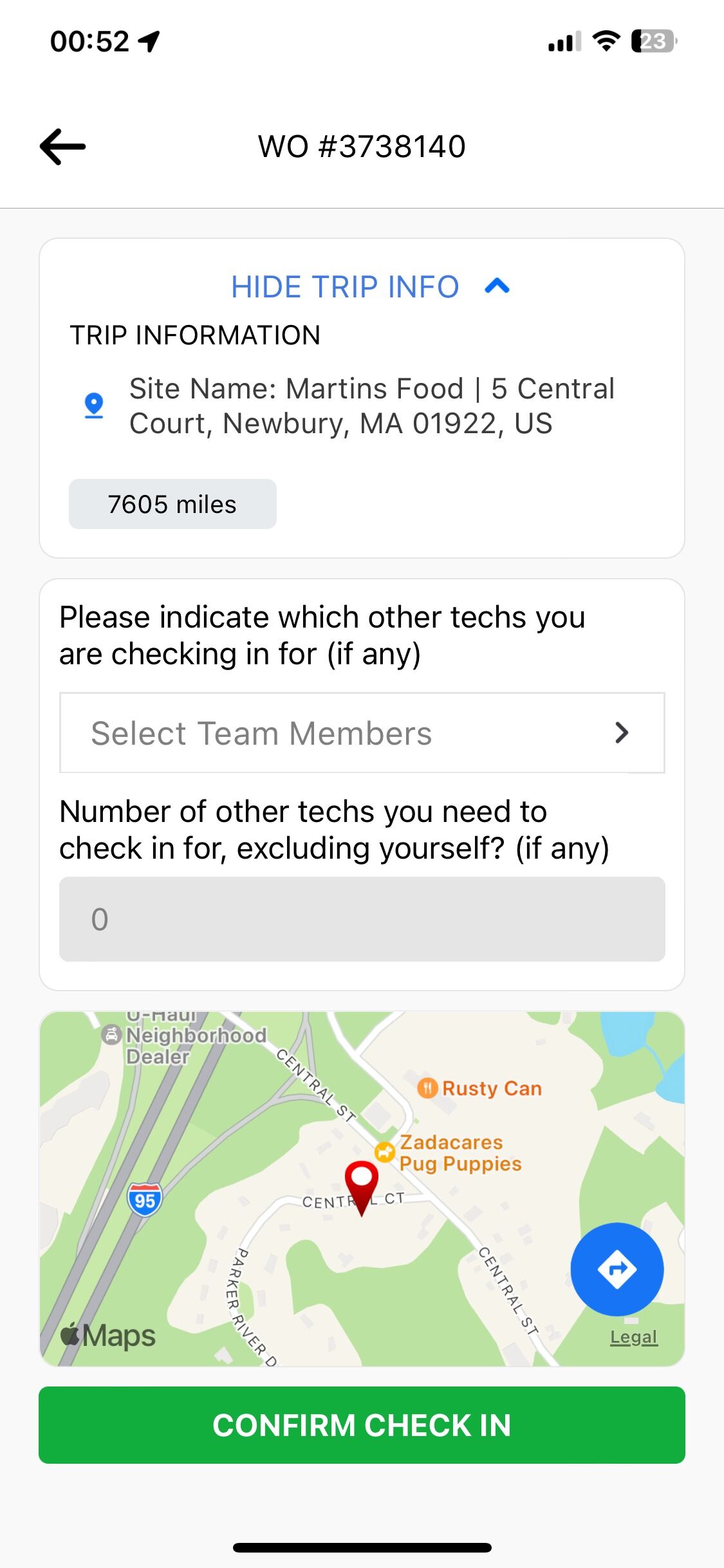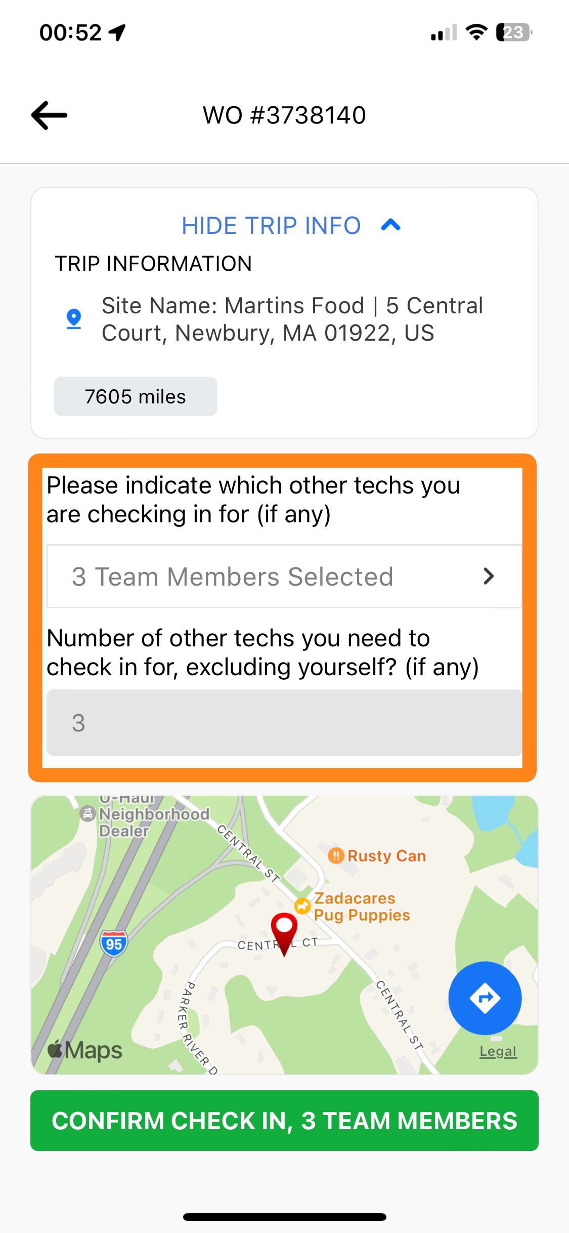 8. Deberías ver un recuento de los miembros del equipo seleccionados. Desplázate hacia abajo y haz clic en el botón verde para confirmar el registro de entrada.