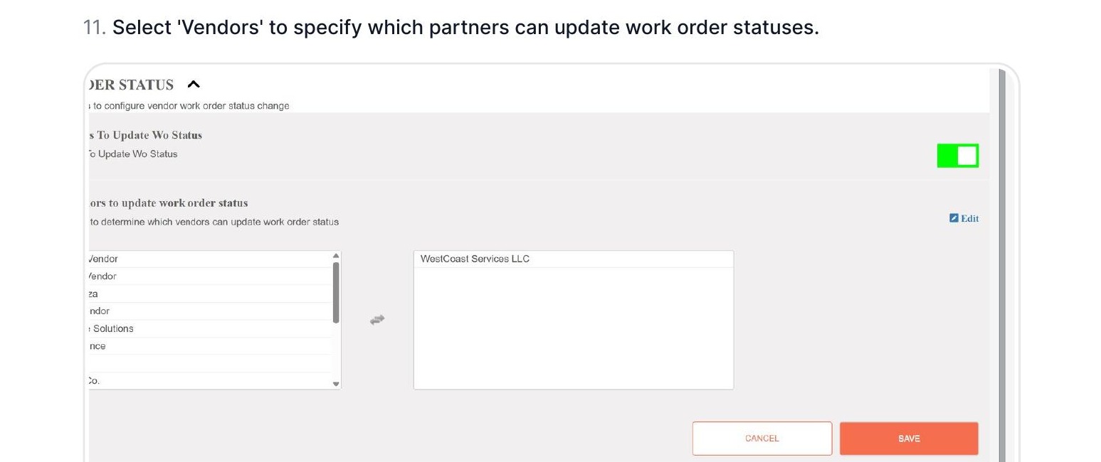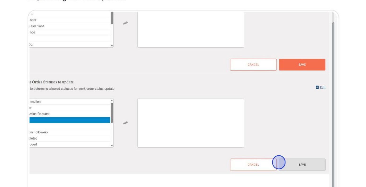 Click Edit next to "Allowed Vendors to update work order status." Select vendors from the left-hand list and move them to the right-hand side, then click Save. Only these vendors will see custom statuses on theirportal.