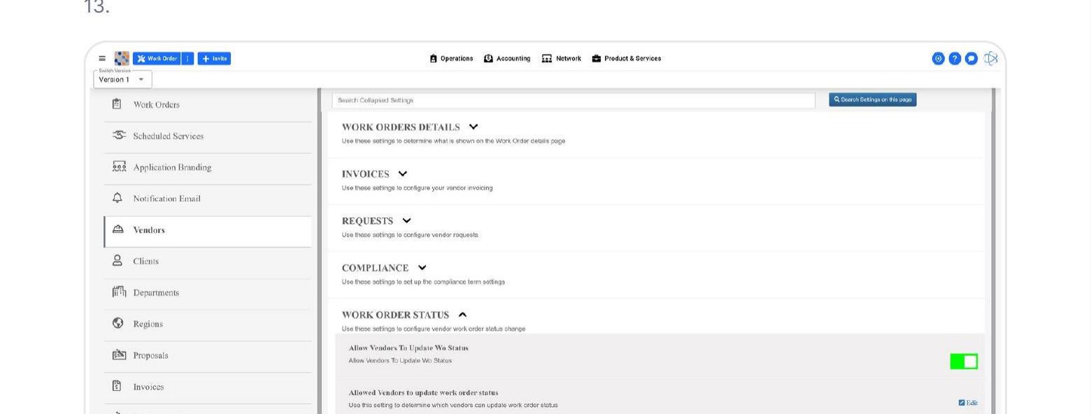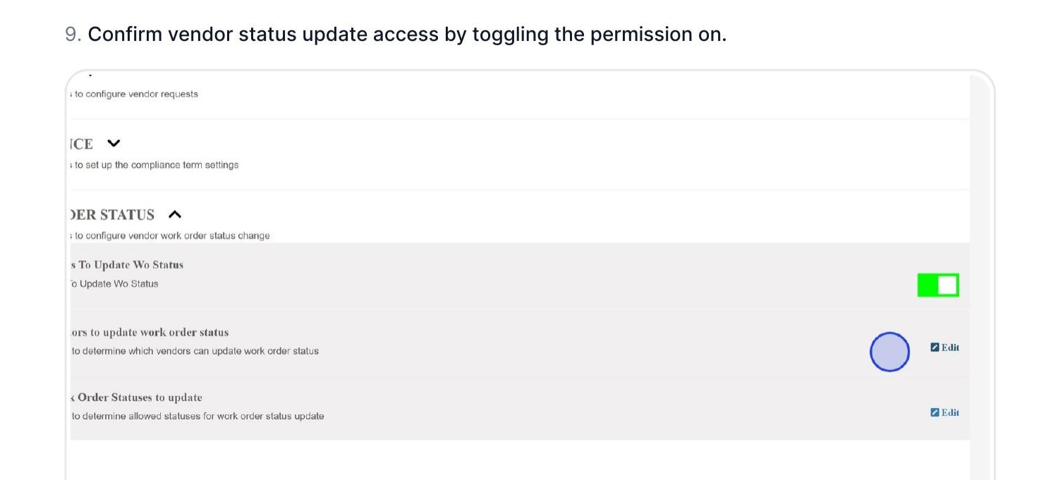 Turn on "Allow Vendors To Update Wo Status" to activate the feature. This is the master switch. When this