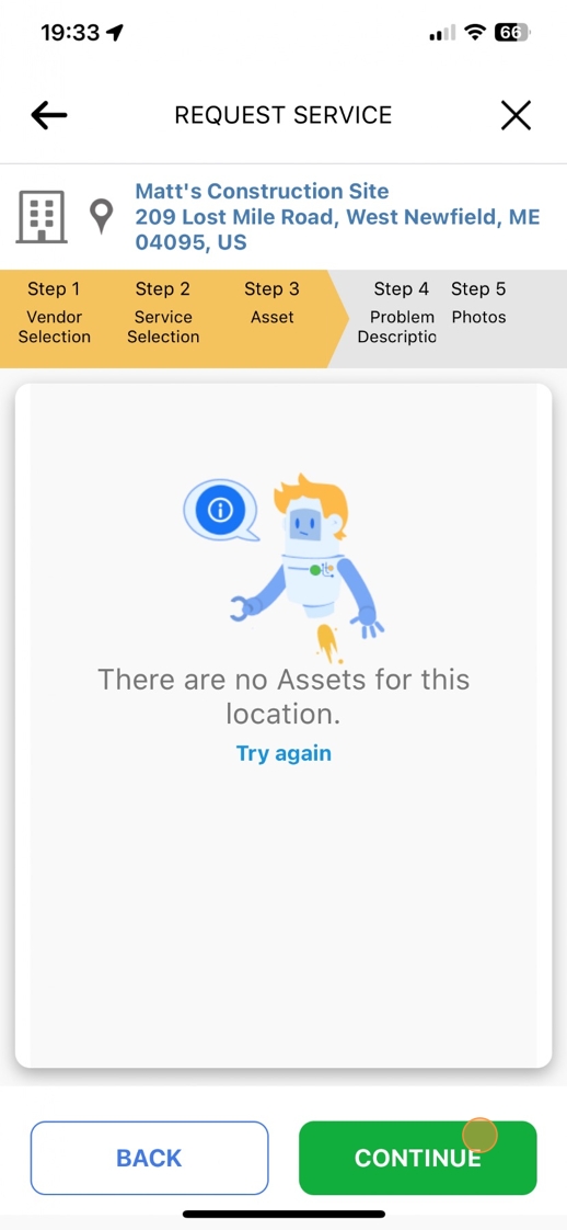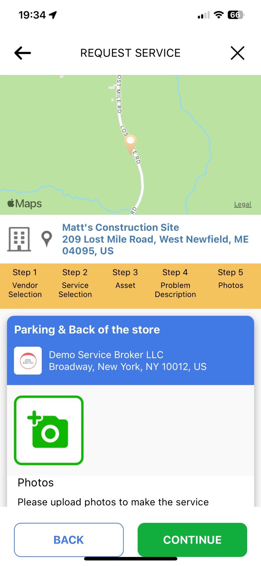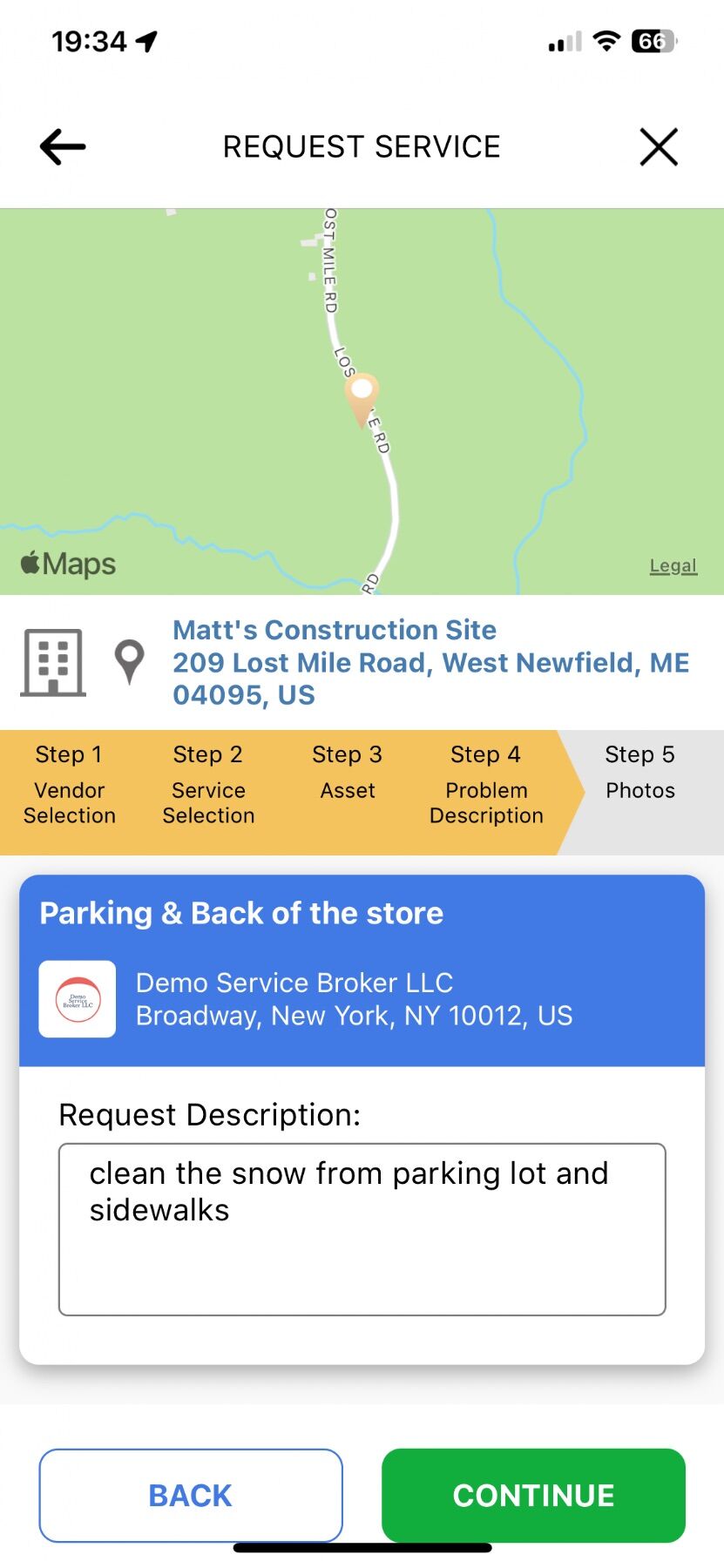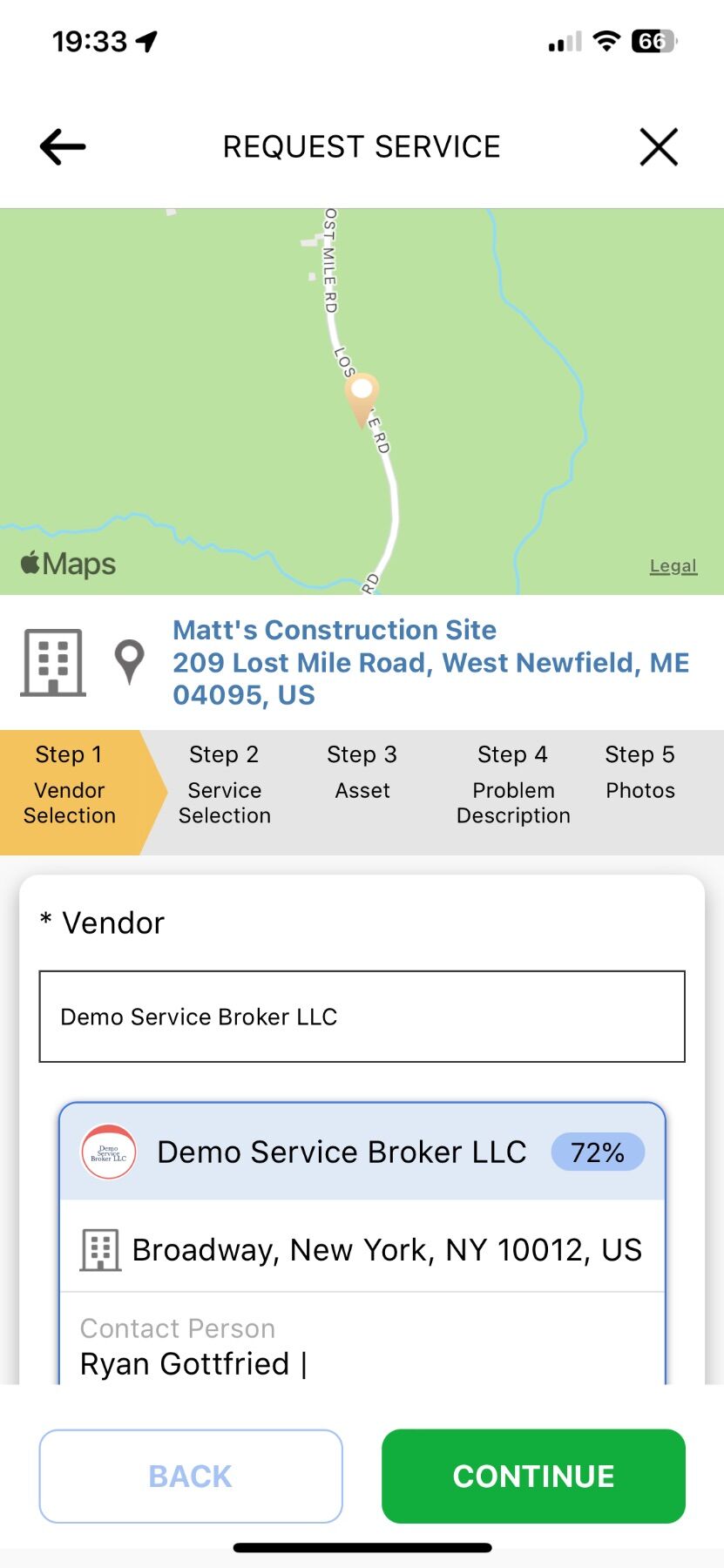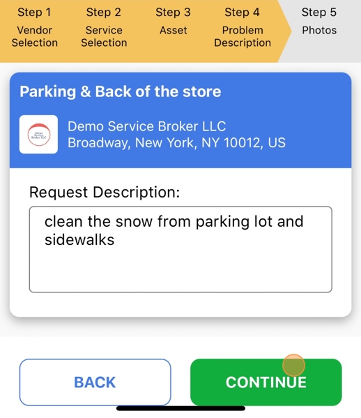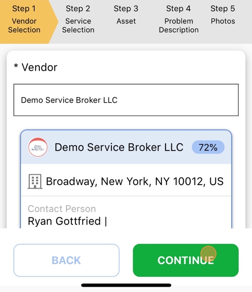 2. This will take you to the Service Request creation page. Click on the green button "CONTINUE". Your Vendor will be preselected since you're invited to the portal and mobile application by your broker