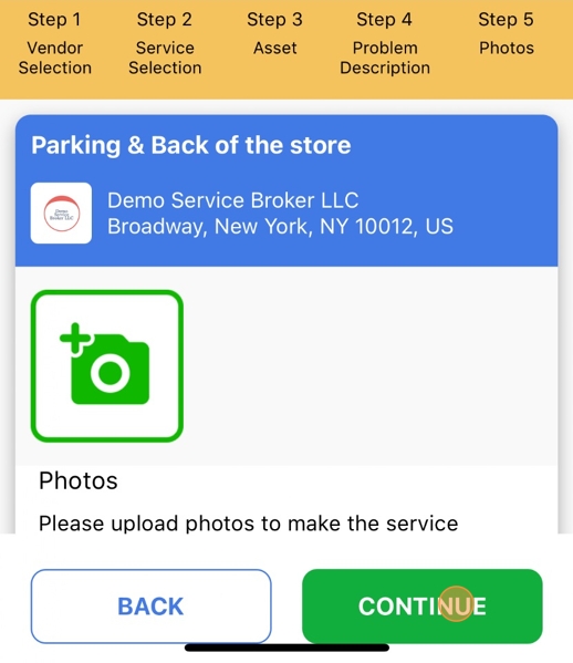 6. You can take pictures and attach them to the Service Request. Click on "CONTINUE" after this.