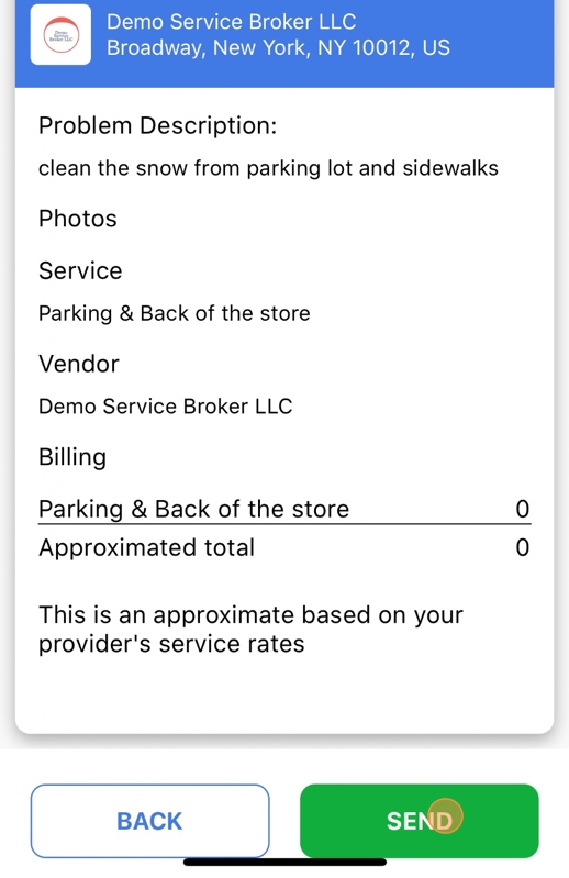 7. This will take you to a Service Request overview page. Click on the green button "SEND" and your Service Request will be sent to your Broker